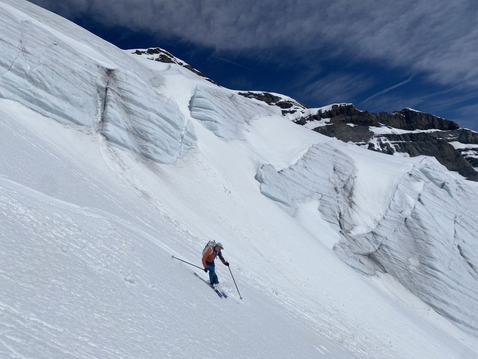 Abstieg auf gleicher Route. Abfahrt kurz gut, dann bald immer stärkerer Bremsschnee.