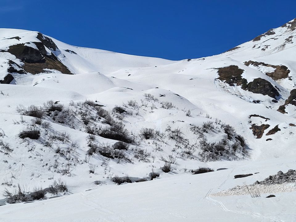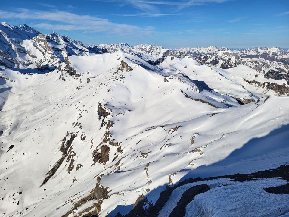 Die direkte Traverse vom Schildhorn zum Rota Härd war vereist und sah nicht gut aus, deshalb bin ich zu Fuss dem Westgrat gefolgt bis kurz vor dem Sattel. Schon im ersten Hang hatte es grosse Gleitschneerisse. Dieses Problem begleitete mich auf der ganzen Tour.