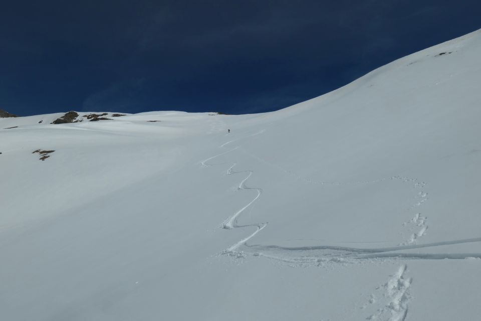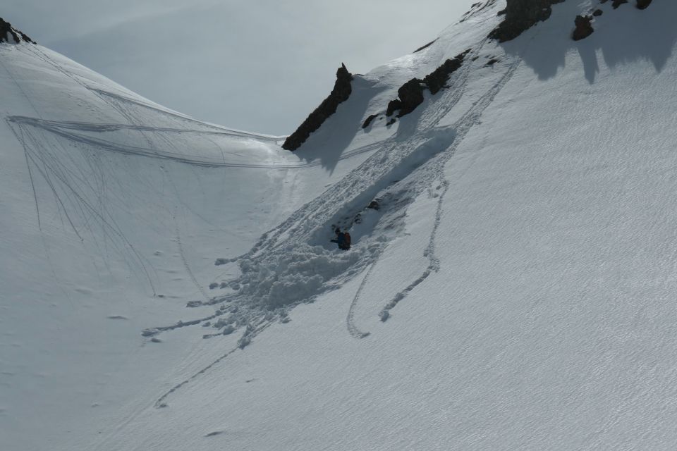 Auf 2600 wurde ein Schneerutsch ausgelöst, kleine Lawine bis auf den felsigen Grund, zum Glück ohne Folgen, siehe persönliche Bilder.