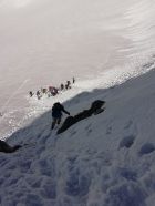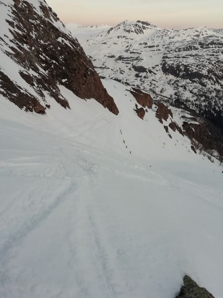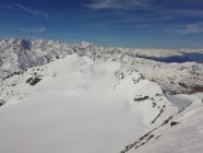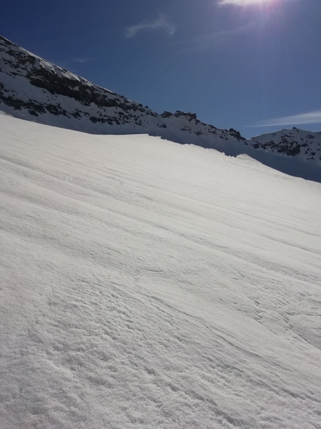 Schnee morgens allgemein gut durchgefroren, auch auf dem Alpjergeltscher. Südgrat sehr gut zu begehen, war noch bis 11 Uhr gefroren. Abfahrt auf Firn (tragend) bis 100 m unter Hohmattusattel, danach allmählich tieferer Sulz, erst ab ca. 2200 tiefer Sulz bzw. Bremsschnee. Wir sind auf ca. 2200 m Richtung Simplonpass gequert, das ist etwas steiler, war aber sehr gut zu fahren, und erspart den Gegenanstieg.