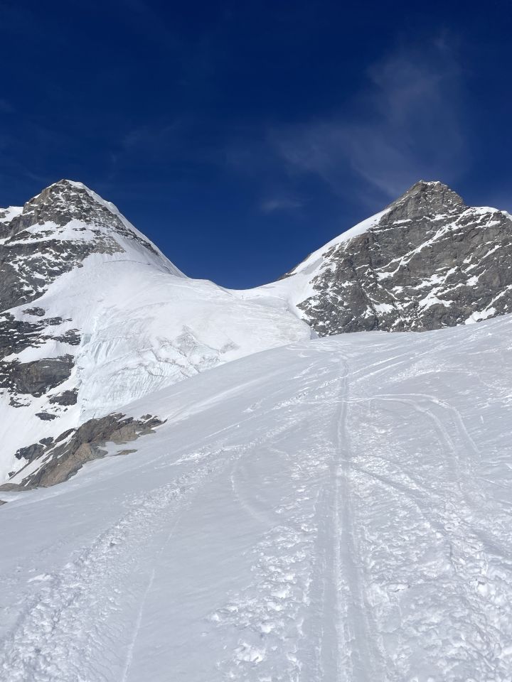 Abfahrt vom Skidepot direkt durch die NO Flanke nicht mehr nur Pulver aber super Verhältnisse.