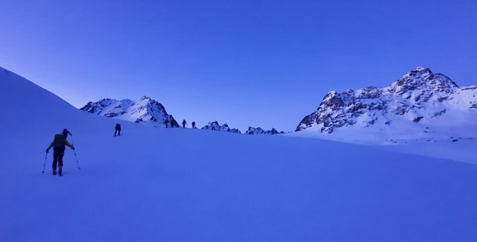 Dann erneuter Aufstieg auf den Kesch Pitschen. Anschliessend Abfahrt durch die Nordhänge bis ca auf 2500 m verlangte etwas Einsatz. Mix mit leichtem Deckel, Presspulver und wenig Sulz.