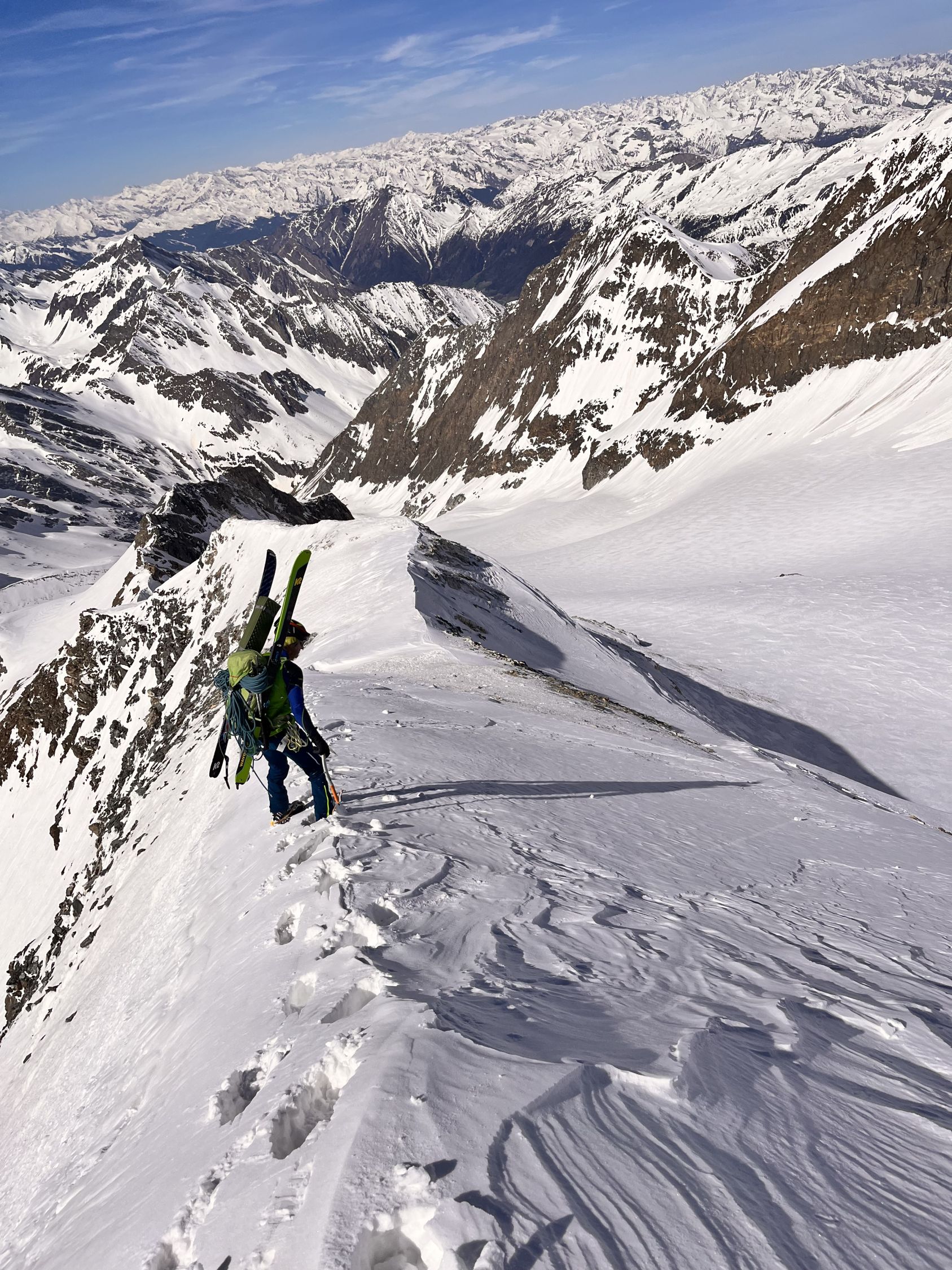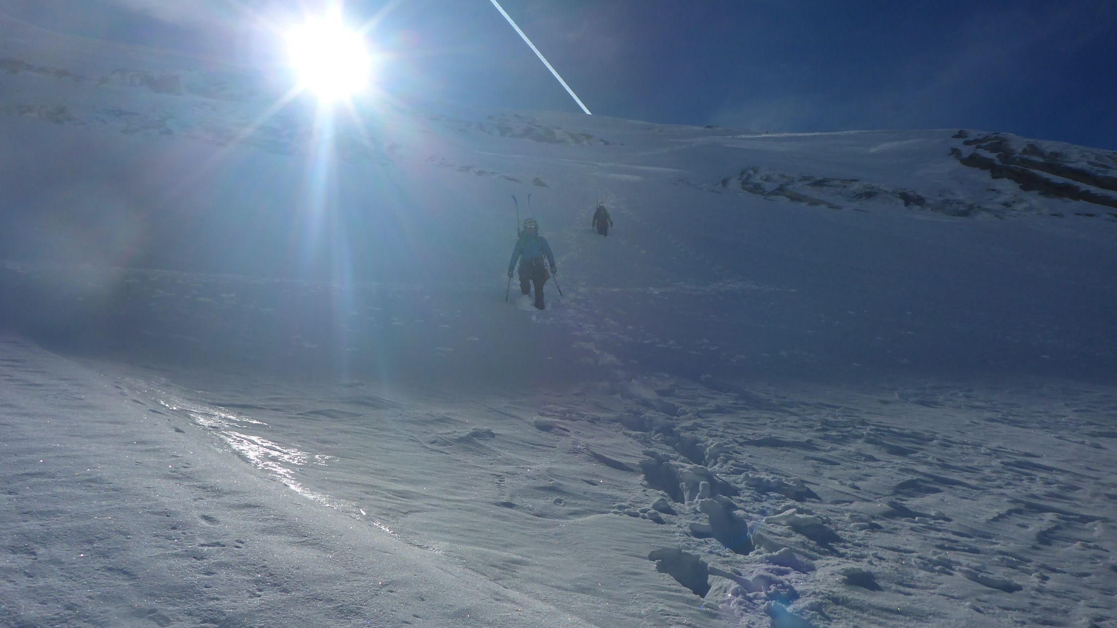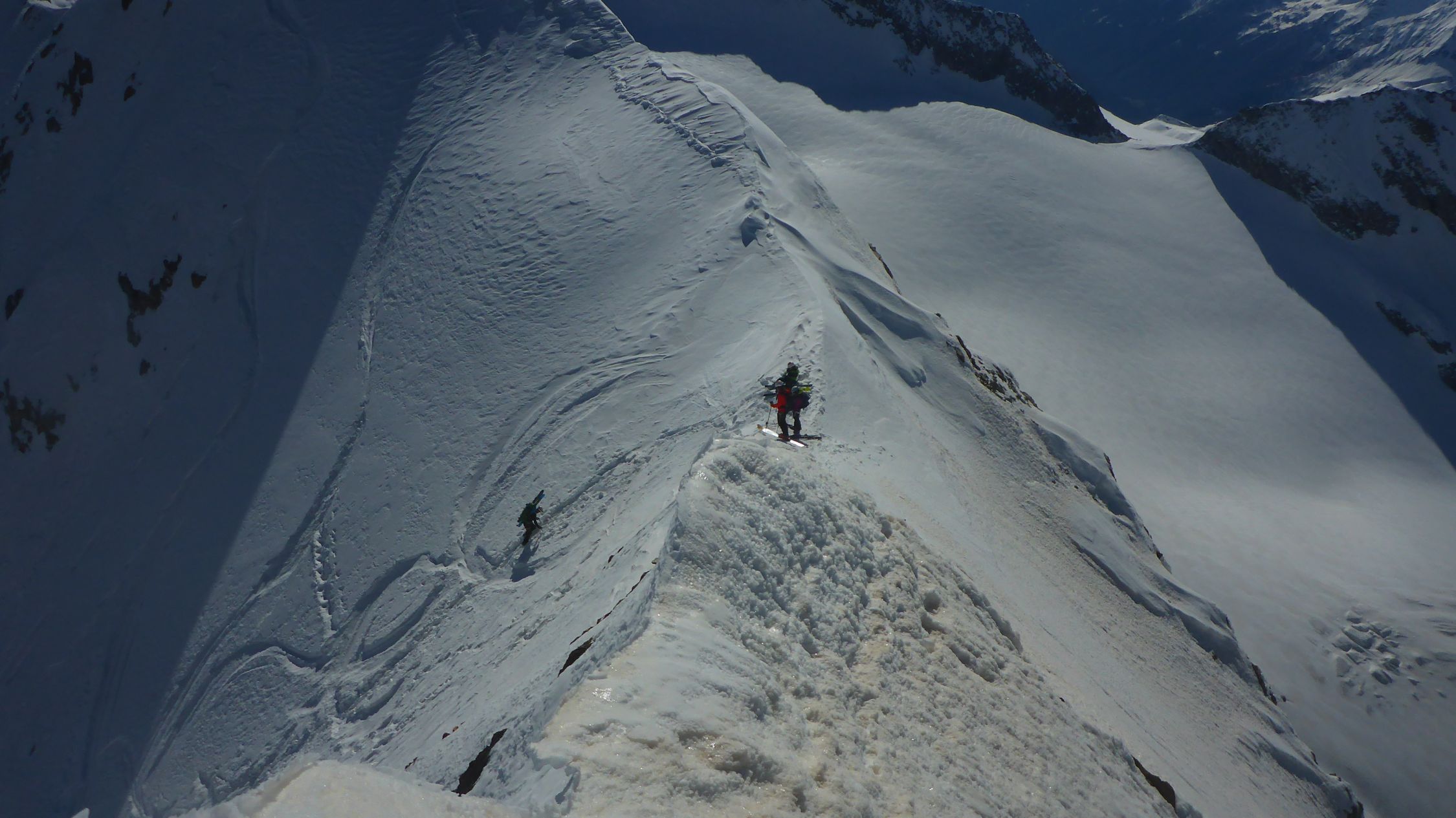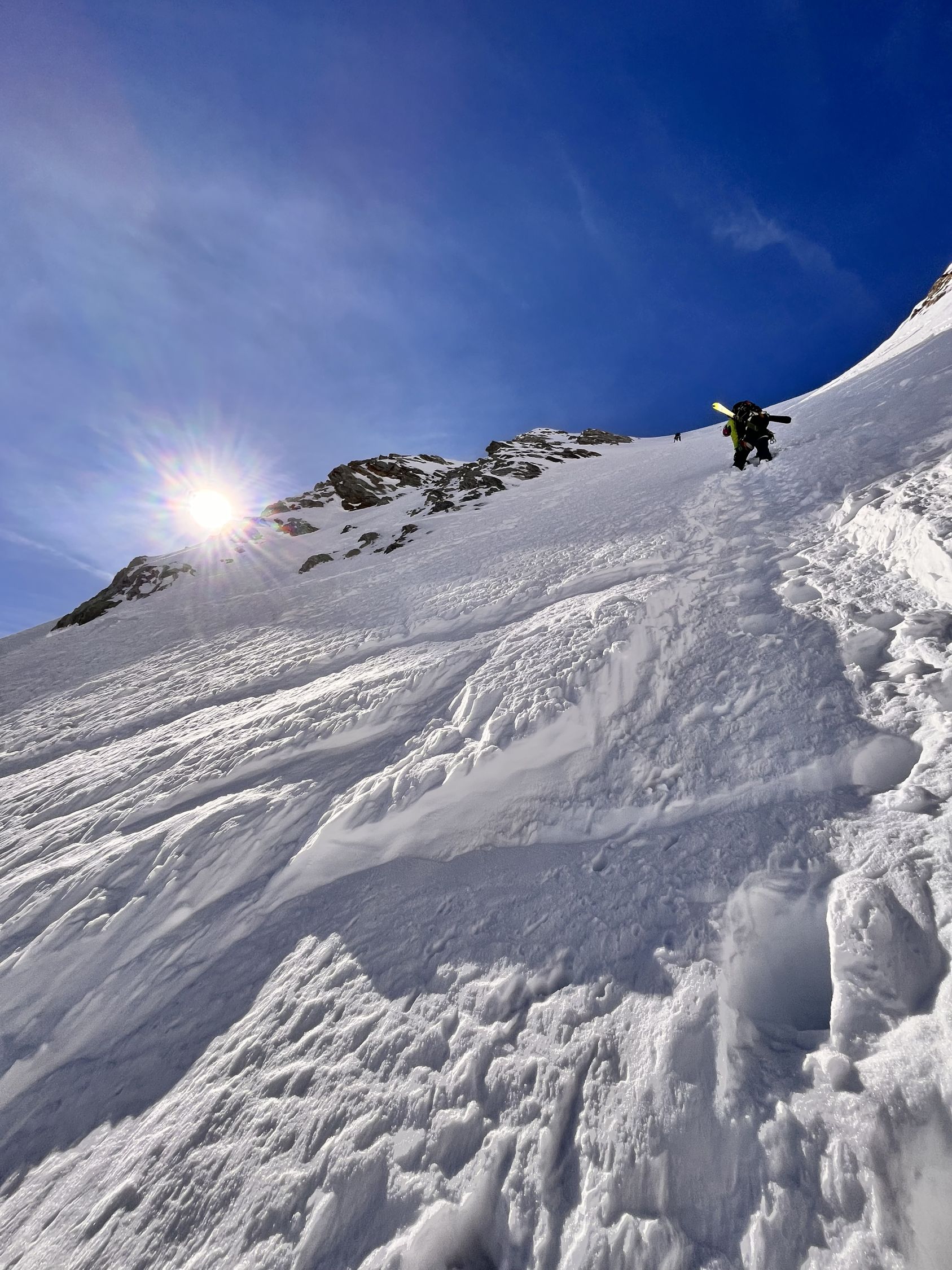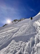 einfach ein Traum, bester Stapfschnee in der Nordwand, Randkluft sehr gut zu überwinden, gut angebunden und keine Wächte, Wurde auch von 2 Personen mit Ski abgefahren. Ätzend dann im Abstiege die letzte Aufschwung zur Umgehung der talseitigen Steilstufe (WInterroute)