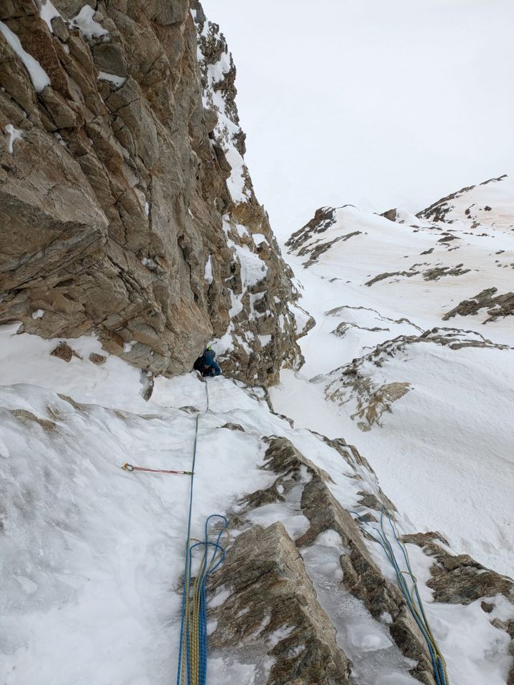 Momentan liegt noch viel Schnee in der Route was das finden der Schlaghaken erschwert. Im Joos Couloir liegt Schnee, ob darunter gutes Eis ist haben wir nicht gesehen.