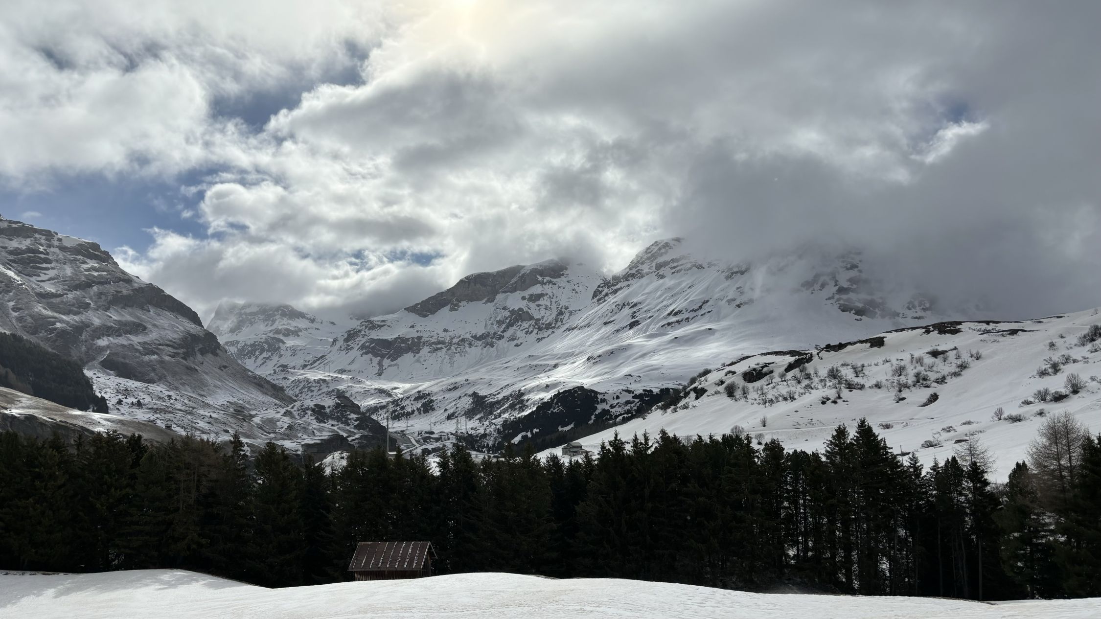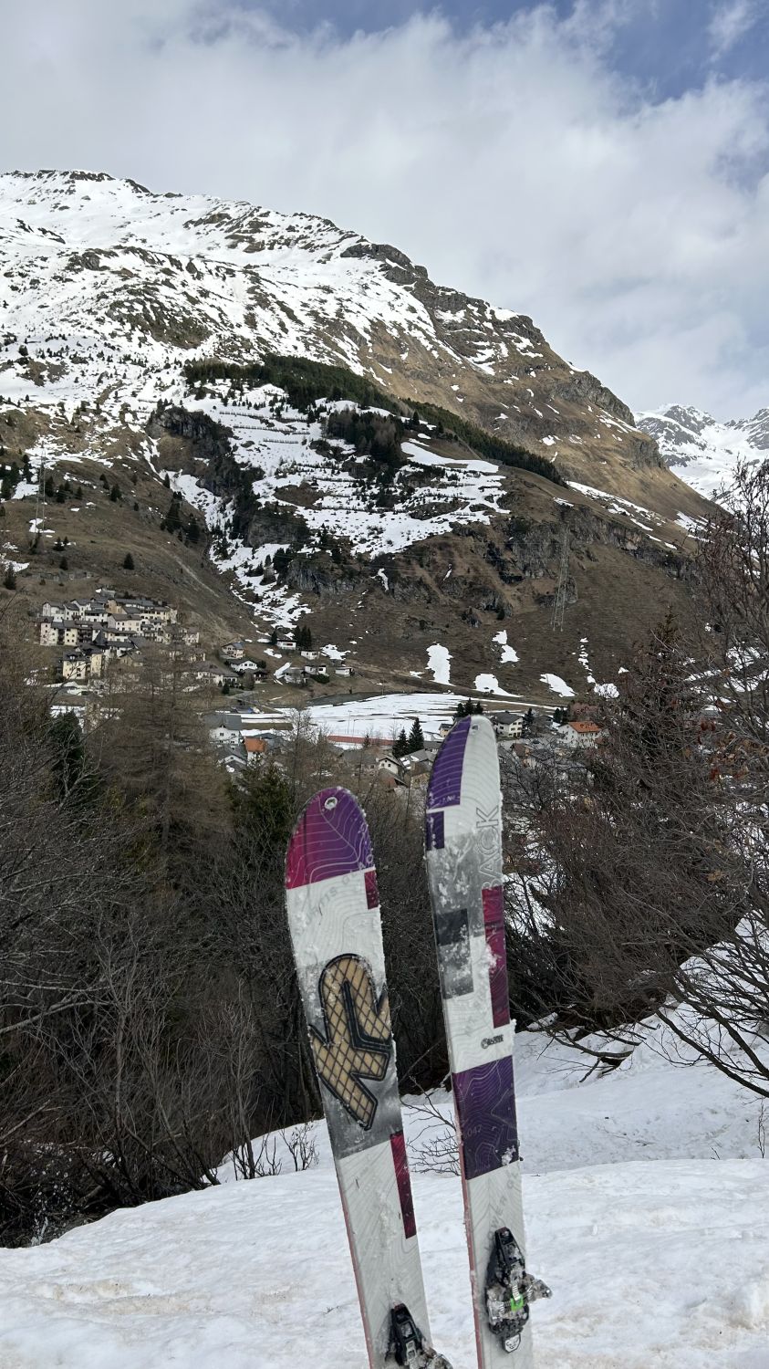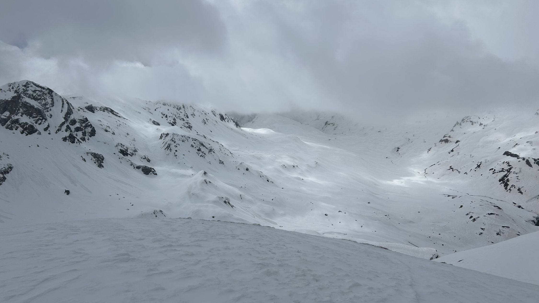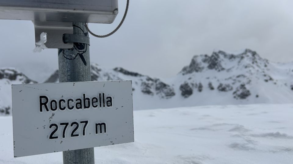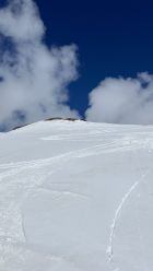 Durchgehende Schneedecke von Skilift Bivio bis zum Gipfel. Wetter heute alles von Nebel, Sonnenschein, Sturm und Schnee, waren alleine auf dem Gipfel. Schnee bei der Abfahr bis unten gefroren.