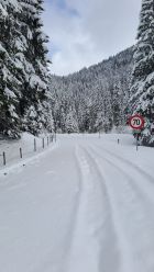 Am Bädle ca. 20 cm Neuschnee, genug um auf der Straße aufzusteigen. Mit zunehmender eher dann deutlich mehr Neuschnee. Ab 11:00 einsetzender Schneefall und eingeschränkte Sicht, aber ausreichend gut um Abfahrtsfreuden zu genießen.