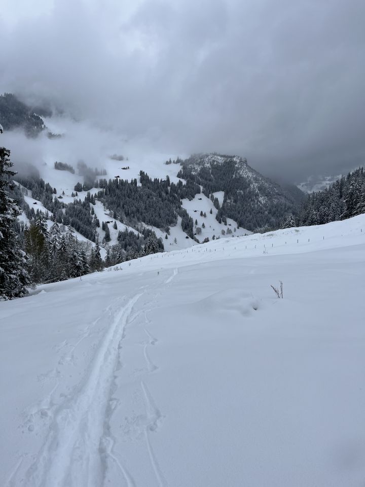 Start um 9.30 Uhr bei Schneefall und knappen Schneeverhältnissen. Ganze Route heute mit Skier begehbar. Mit zunehmender Höhe rasch mehr Schnee. Ab Sennhütte erst richtig genug Schnee. Aufstieg bis unter die Felsen vor dem Wäldchen. Von dort tolle Pulverschnee Abfahrt bis Menigwald mit mehr oder weniger (keiner) Unterlage. Rast an der Sonne und Aufstieg über Hintermenigen auf den Grat.