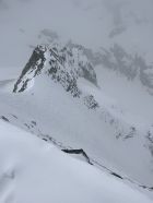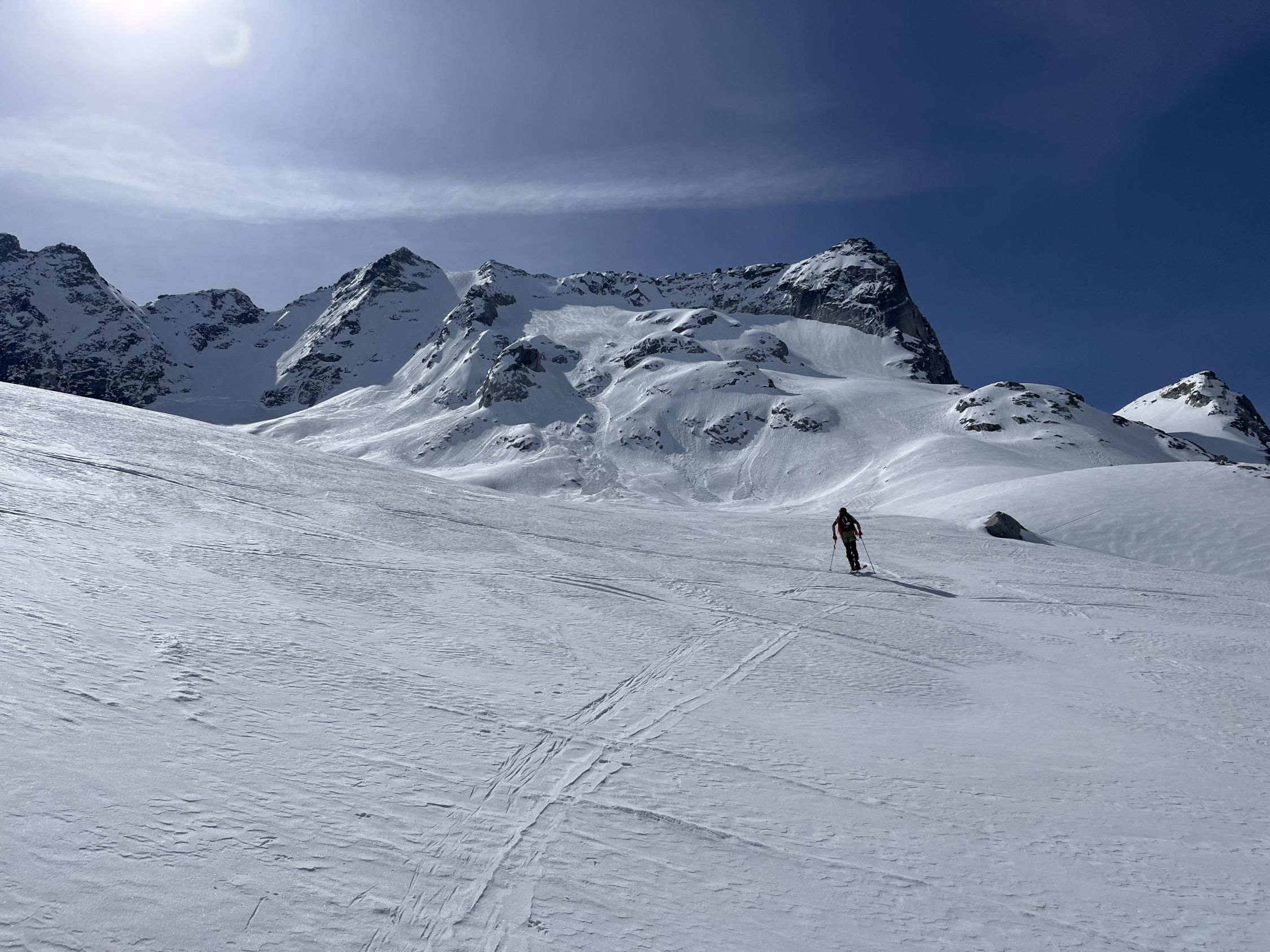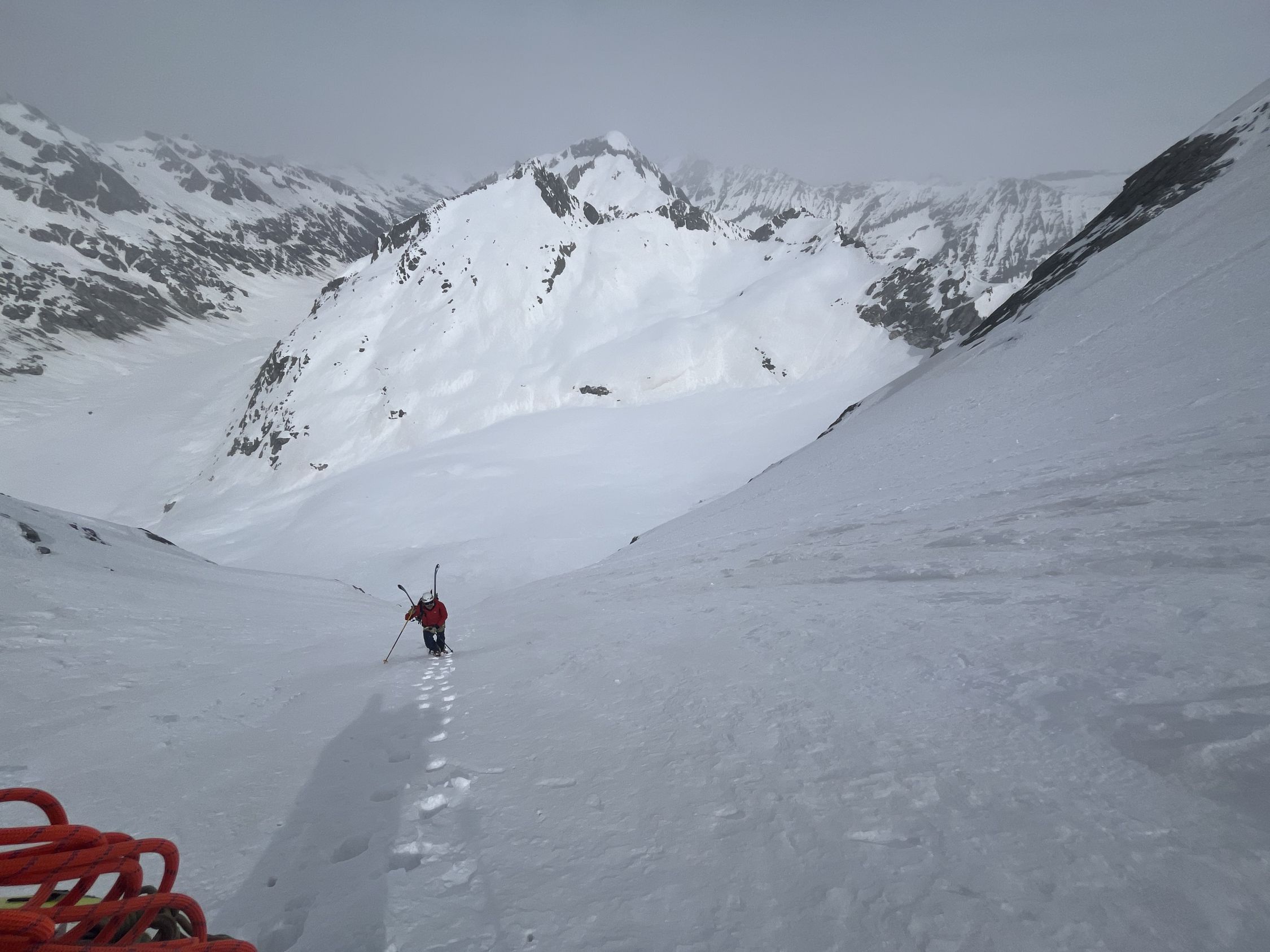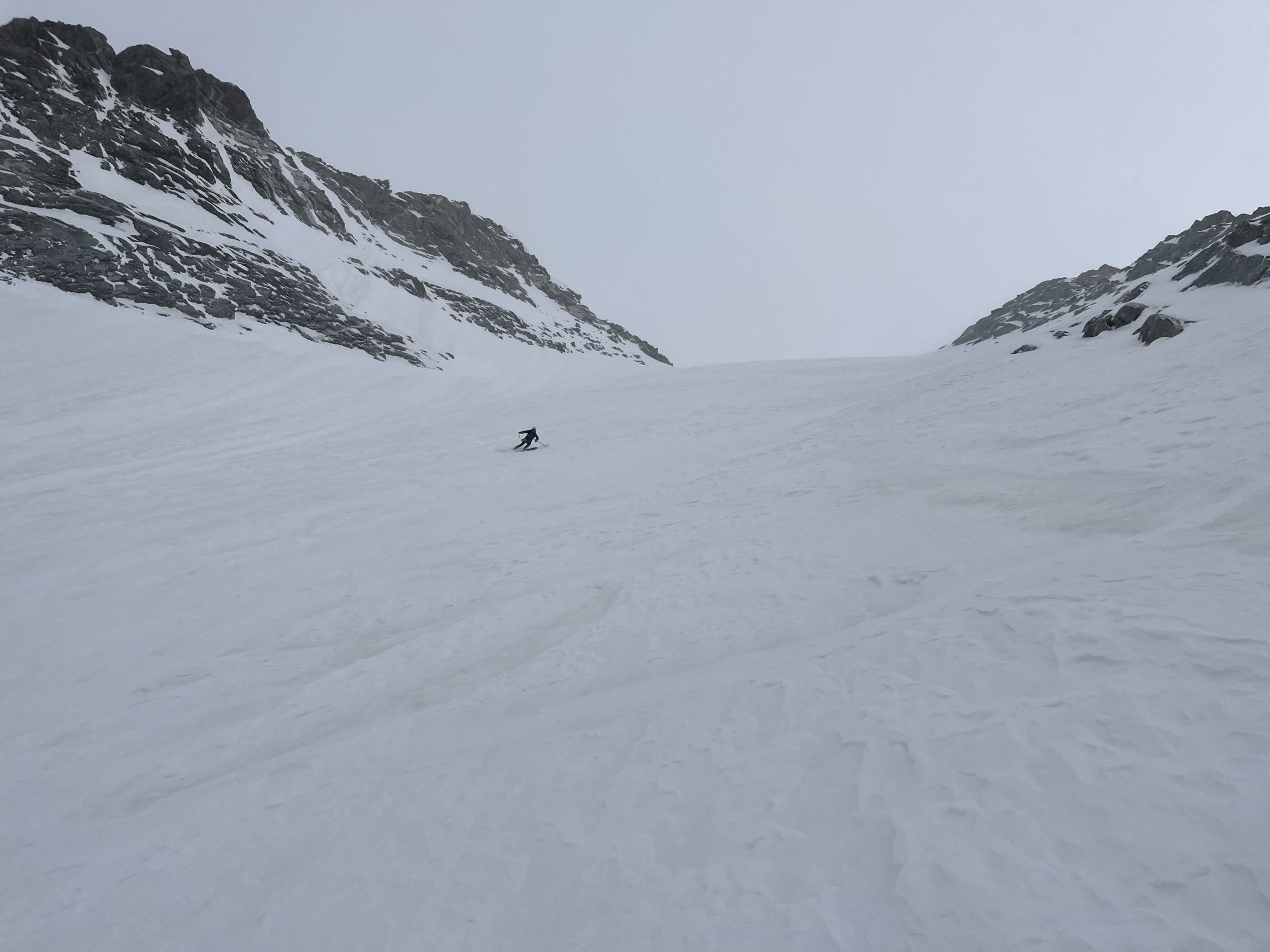 In der Abfahrt oben lockerer, aufbauend umgewandelter und gut gesetzter Schnee und einige spuren. Gut zu fahren. In der Engstelle hart, heute die Crux in der Abfahrt. hier kurz den Pickel als Unterstützung genommen. Danach Bruchharsch, Triebschnee oder hart. Weiter unten Hänge mit Süd-anteil gut aufgefirnt.