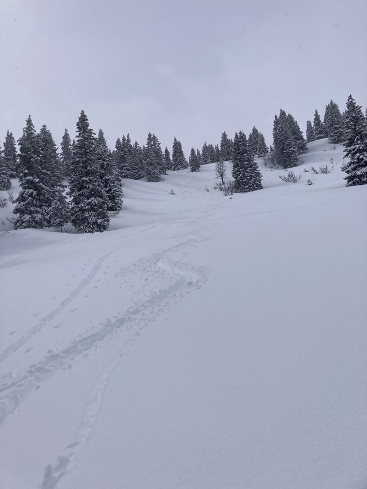Oben sicher fast 70cm Neuschnee, fährt sich super in den steileren Hängen. Die Alpweiden um Schwarzenberg liessen sich super fahren.