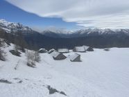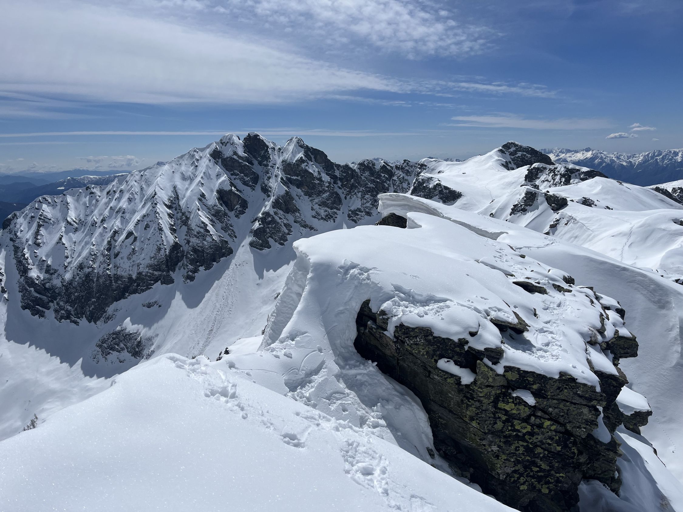 Für Schneeschuhe sehr gute Verhältnisse. Schnee ab etwa 1300 m, durchgehend ab etwa 1500, Schneeschuhe sinnvoll ab etwa 1800 m. Darunter kaum Neuschnee und tragende Unterlage - angenehmer zu Fuss. Weiter oben mehr Neuschnee, max etwa 20 cm, sehr schön. Erstaunlicherweise windstill auf Grat und Gipfel, während es in Varzo stark blies.