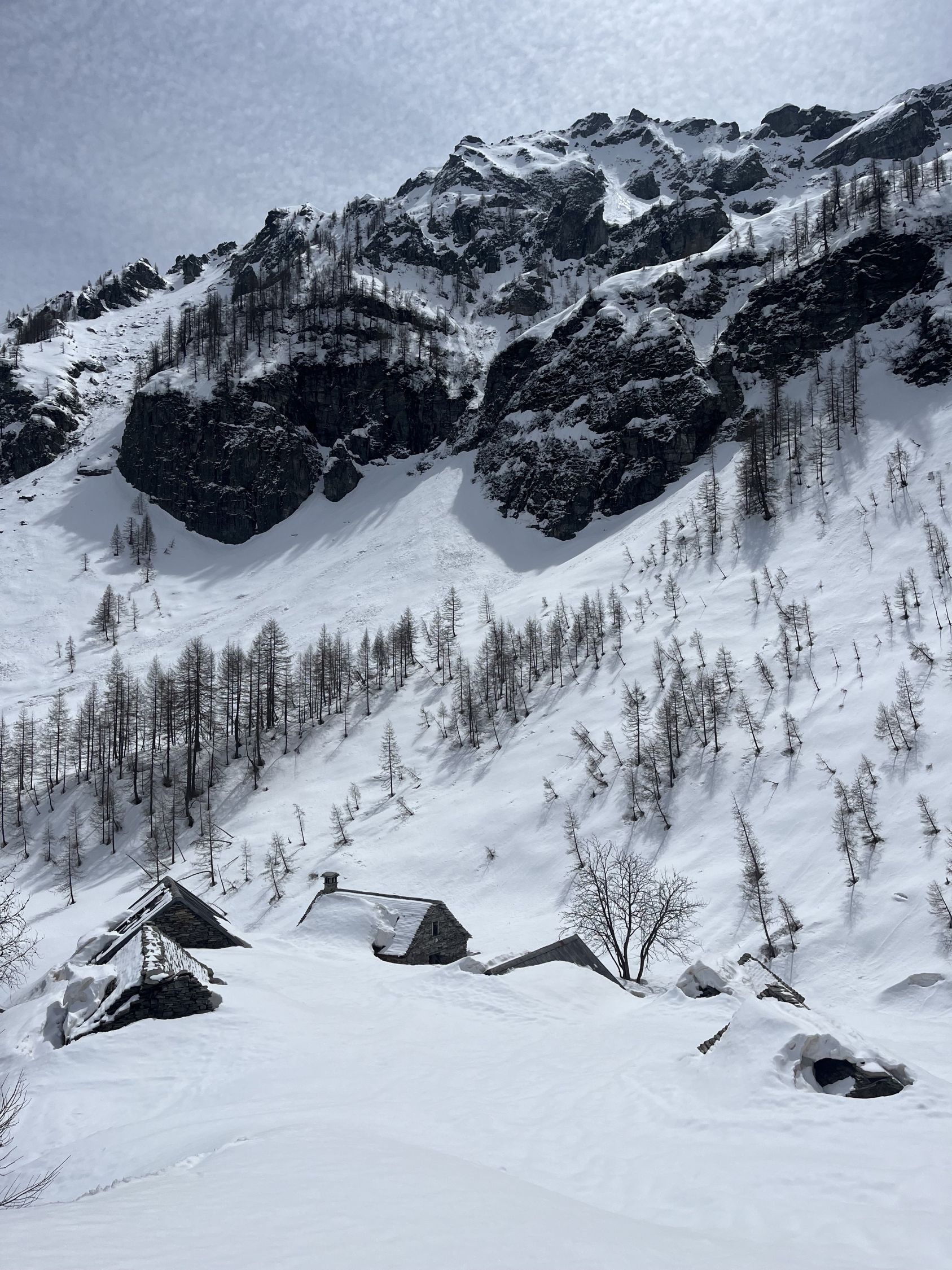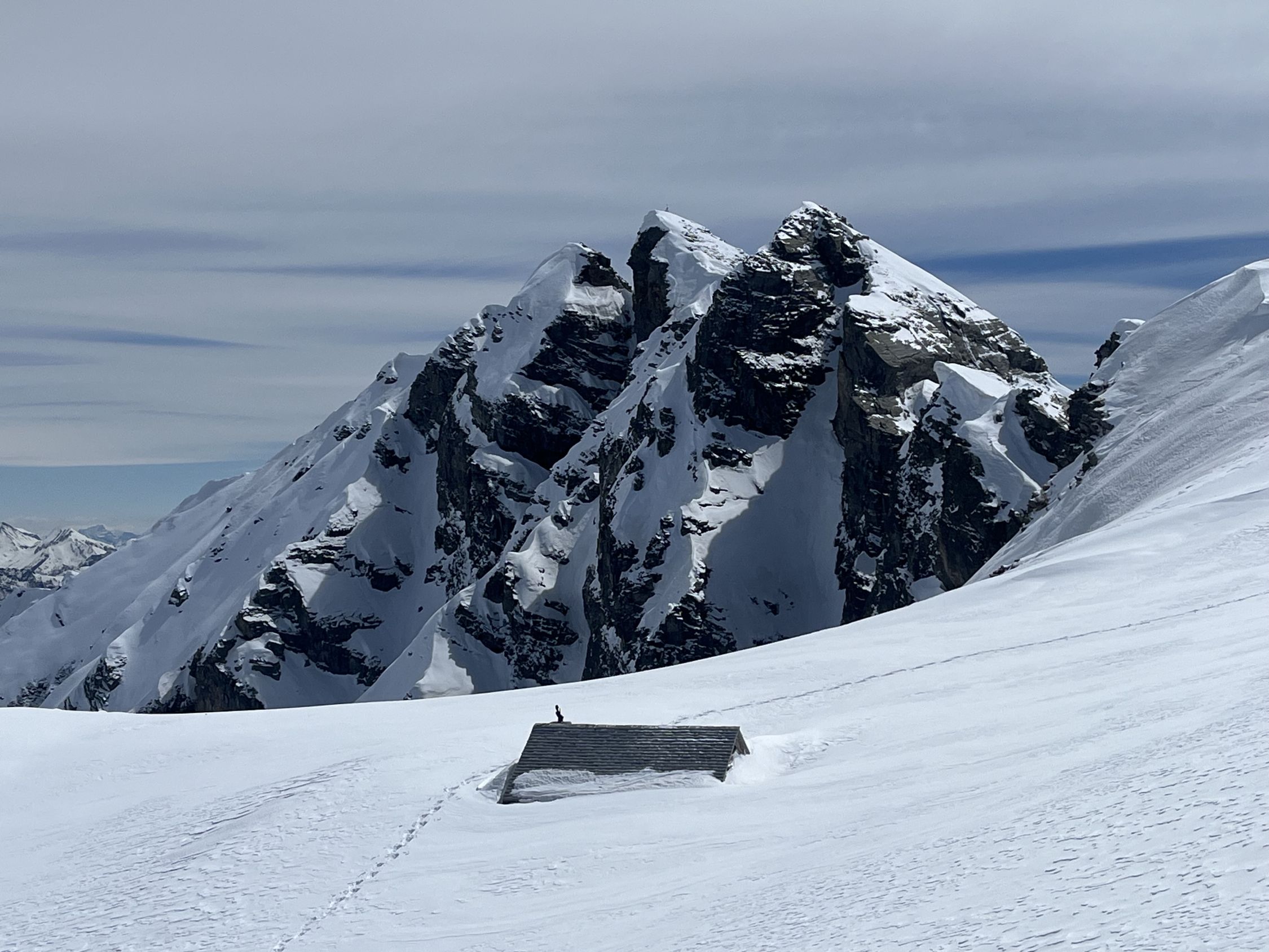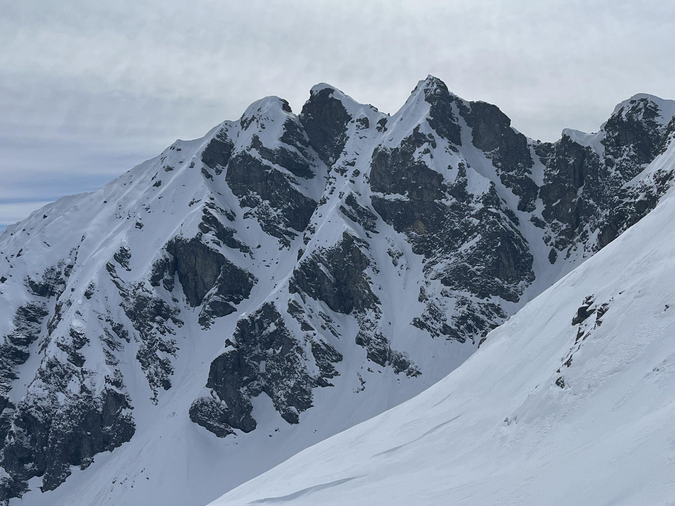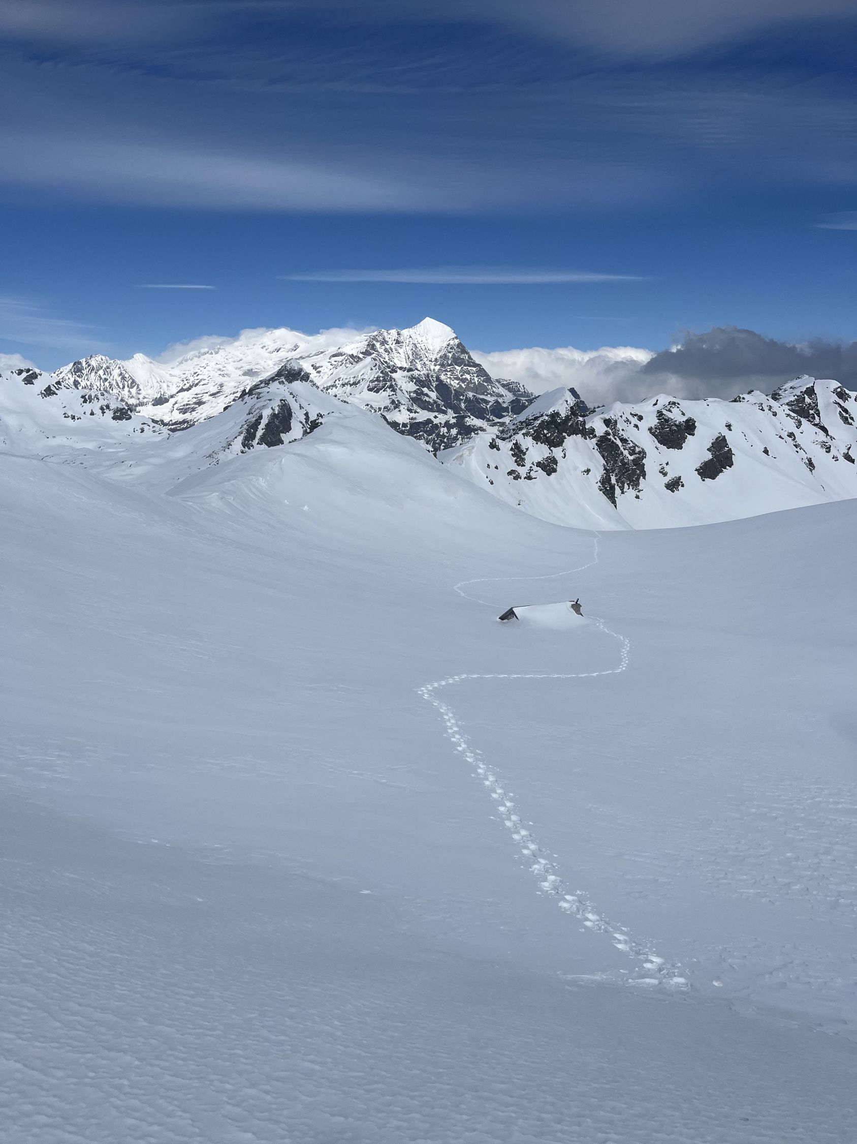 Geplant war zunächst ein Augenschein beim Nordcouloir zum Pizzo d‘Albiona. Dieses ist sehr steil und war mir bei dem sehr harten Schnee zu heikel, Route vgl Foto 2.
