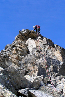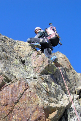 Am Samstag nach dem Hüttenanstieg und einer hervorragenden Knödelsuppe auf die Verpeilspitze (fast schneefrei, keine Steigeisen notwendig). Für versierte Bergsteiger (Schrofengelände im II. Grad) gut seilfrei möglich, Gipfelbereich bei Bedarf gut mit Bohrhaken abgesichert.