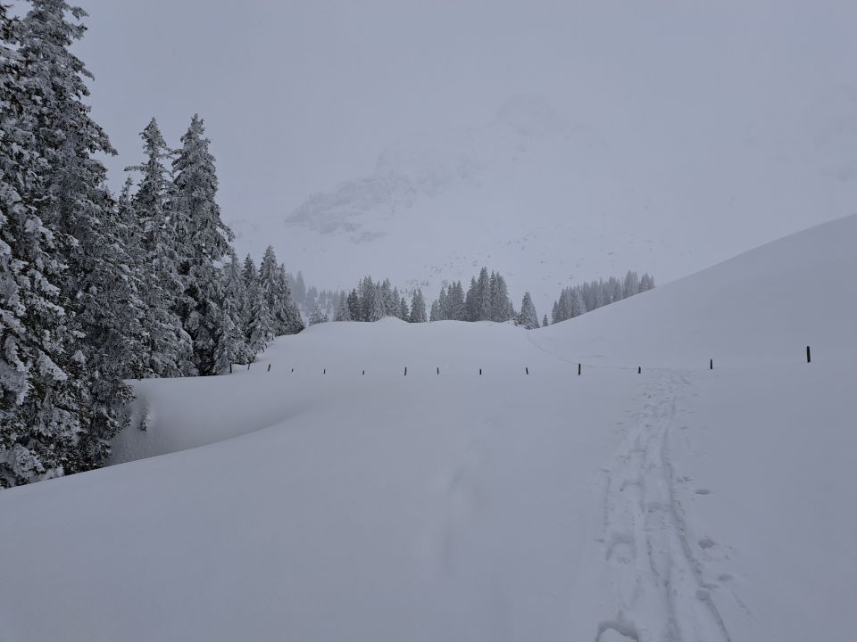 Fyrabetour mit Start 17.15 Uhr zuerst noch bei guter Sicht bis Morgetepass mit guter Spur.