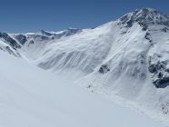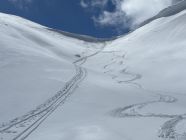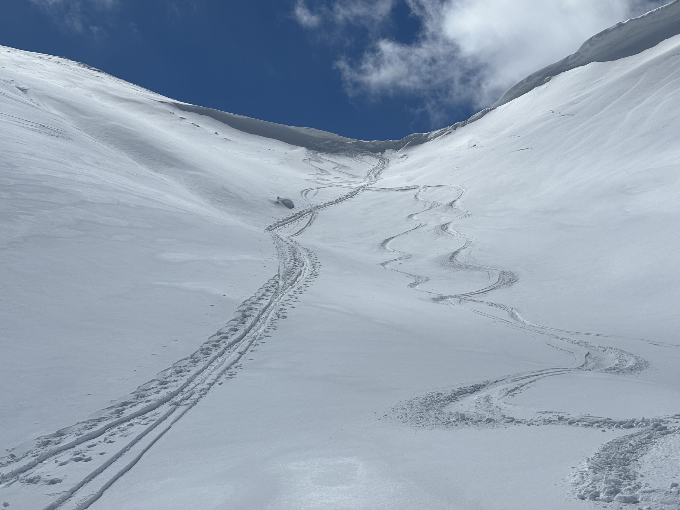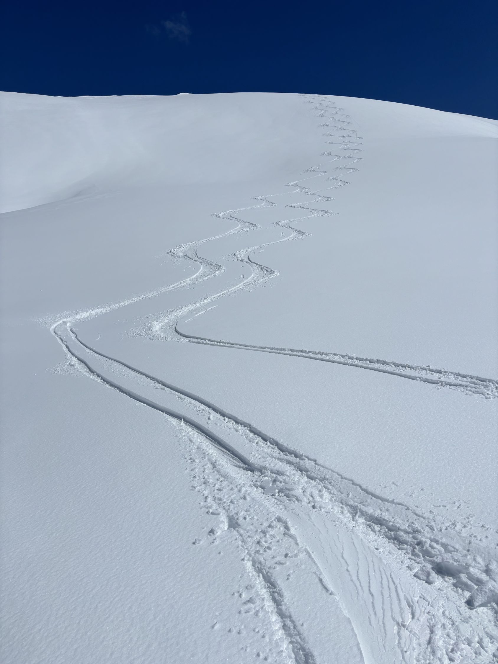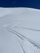 Abfahrt vom Gipfel im Pulverschnee. Wir waren nicht so früh dran, aber um 13 Uhr gings im Gipfelhang immer noch wie durch Butter. Erst unterhalb von zirka 1'800m zog der Schnee langsam an, blieb aber immer noch sehr gut fahrbar.