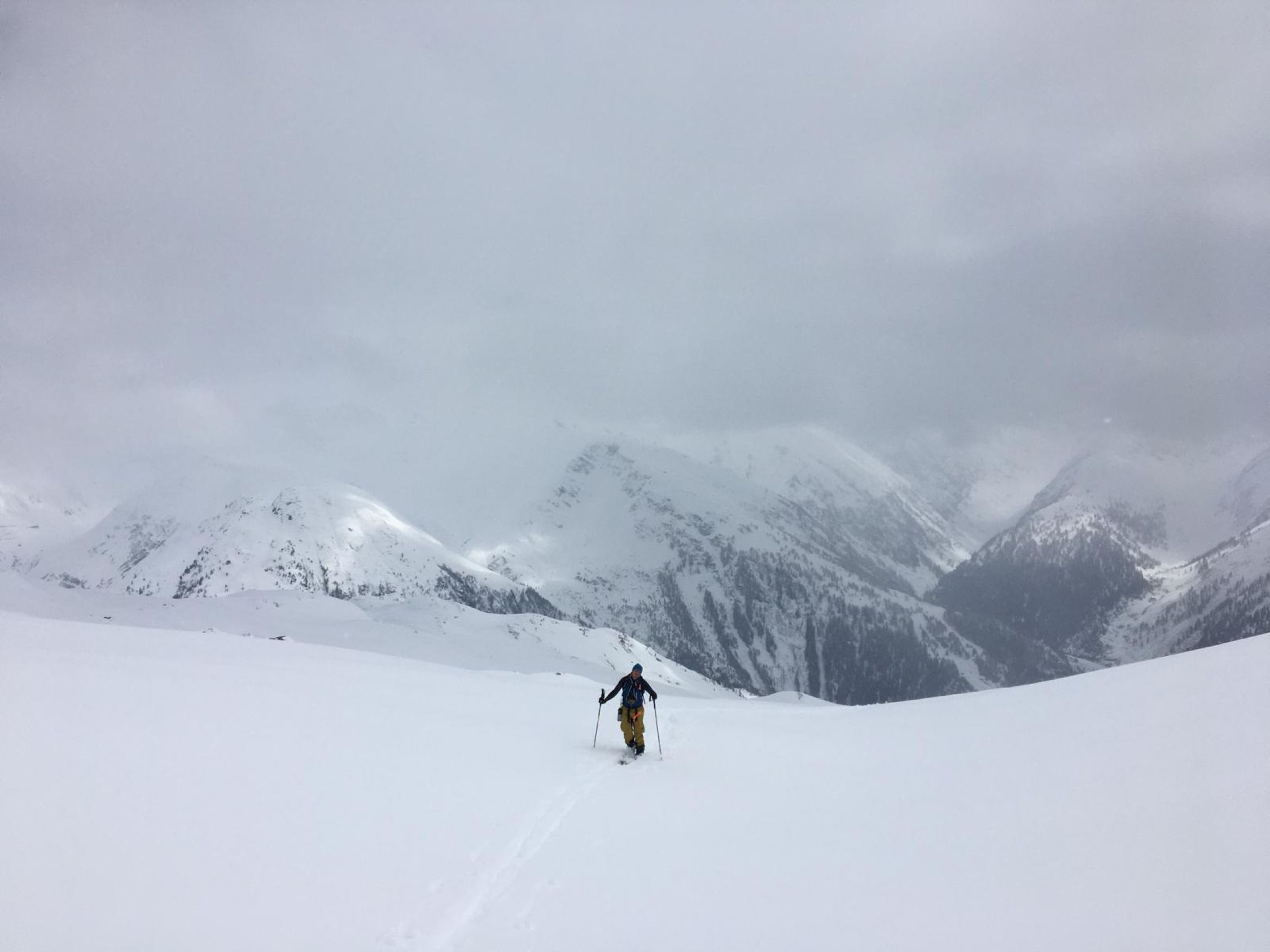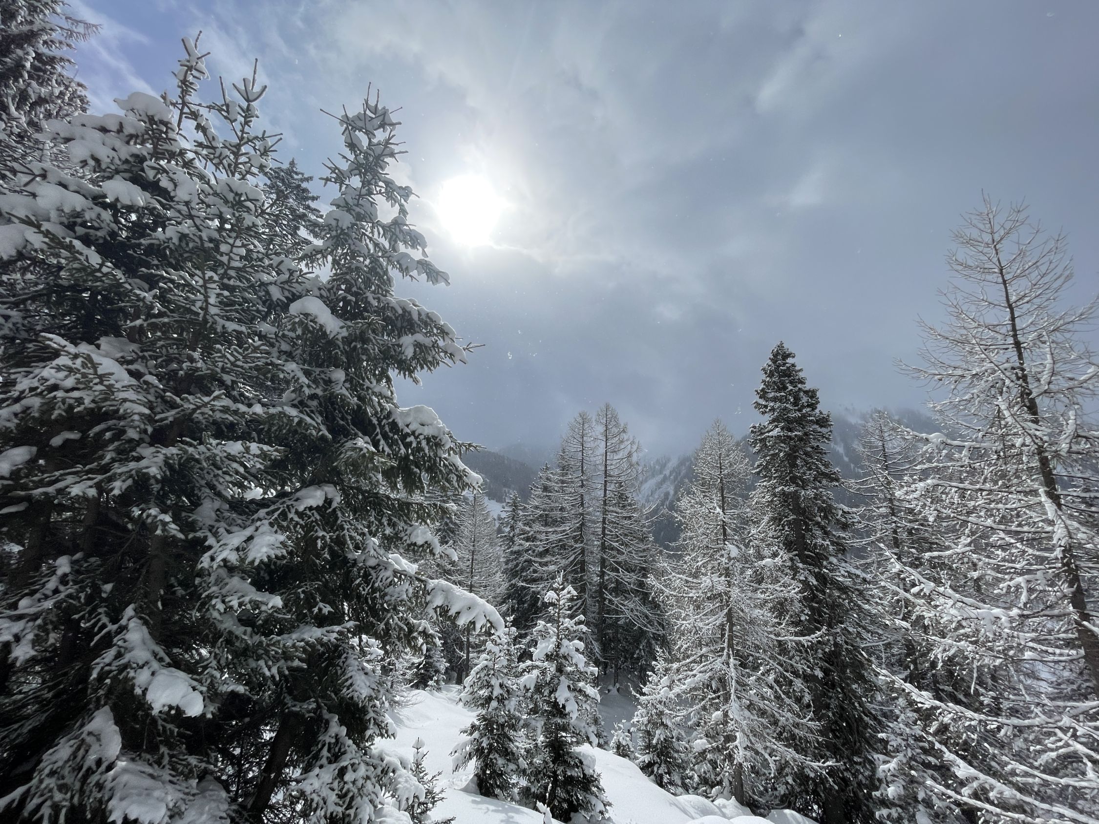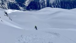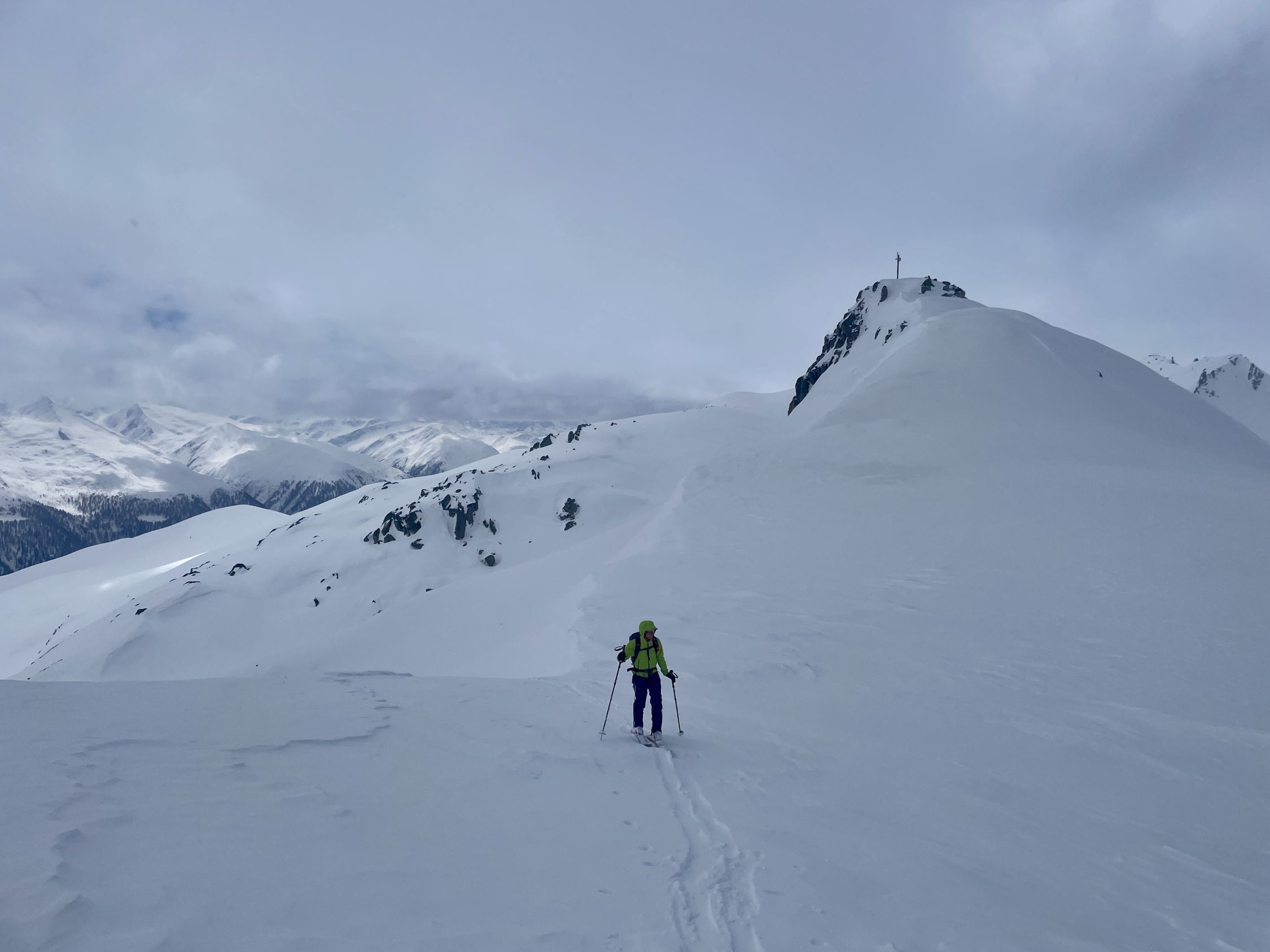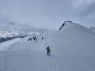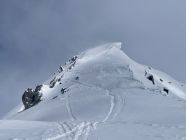 Schneemengen wie im Januar. Eine etwas komische Mischung zwischen Pulver und pappigem Nassschnee. Das Wetter war viel schlechter als prognostiziert; lange leichter Schneefall, fiese Bise, anstrengende Spurarbeit, oben am Grat starker Wind, welcher das Gipfelglück kurz vor dem Gipfel verhinderte. Der ganze Aufstieg war sehr schlechte Sicht, da die Hochbewölkung bis zuletzt vorhanden war. Die obere Hälfte war Abfahrtsmässig ziemlich gut, jedoch sehr "bremsige" Verhältnisse. Unten sehr weicher und schwerer Schnee, relativ mühsam. Bei der Abfahrt durch den Wald, einige Steinkontakte gehabt, daher die Bewertung. Ganz fies war, dass das Wetter erst im unteren Teil der Abfahrt aufklarte und dann richtig Sonnig wurde.
