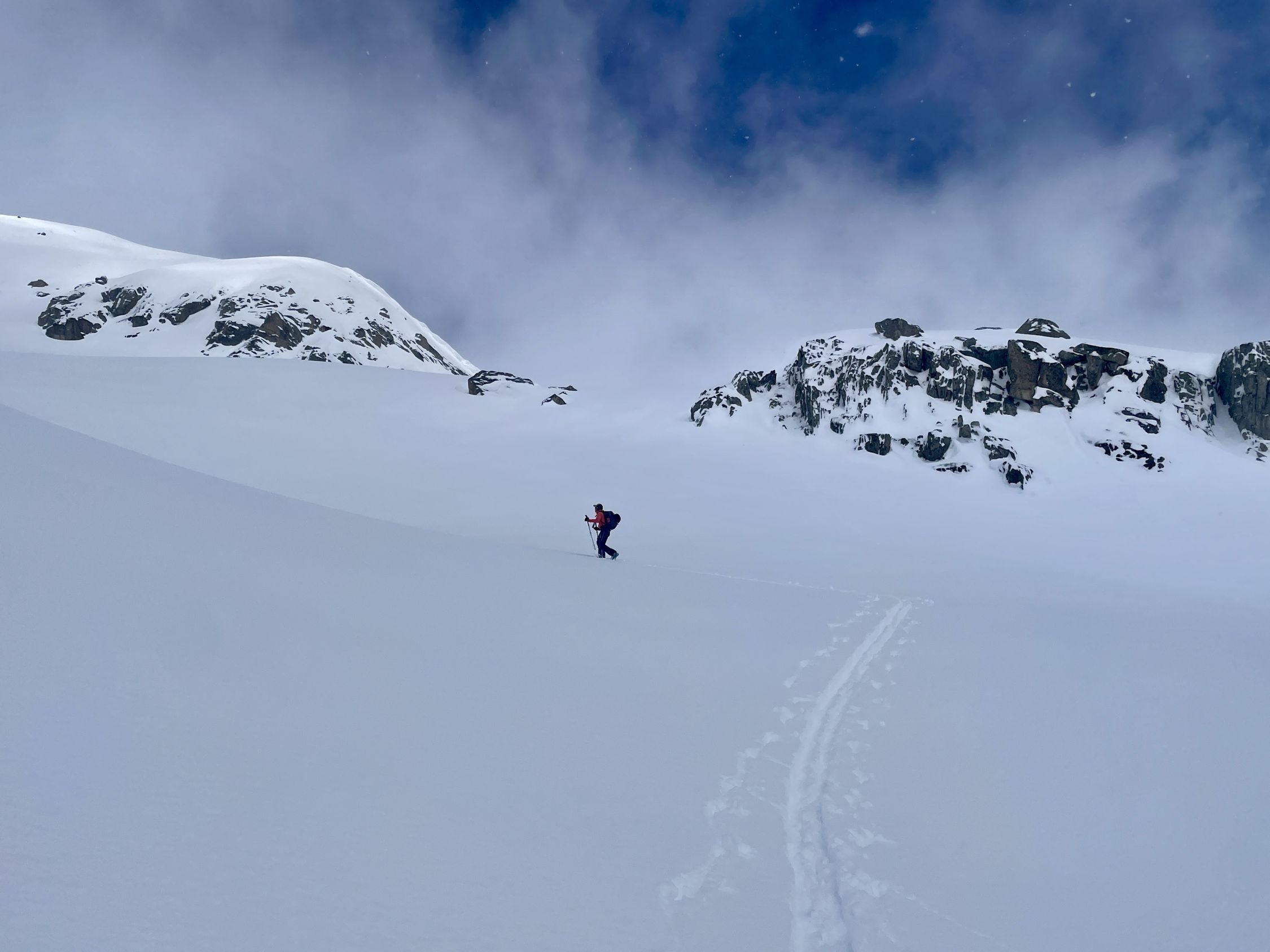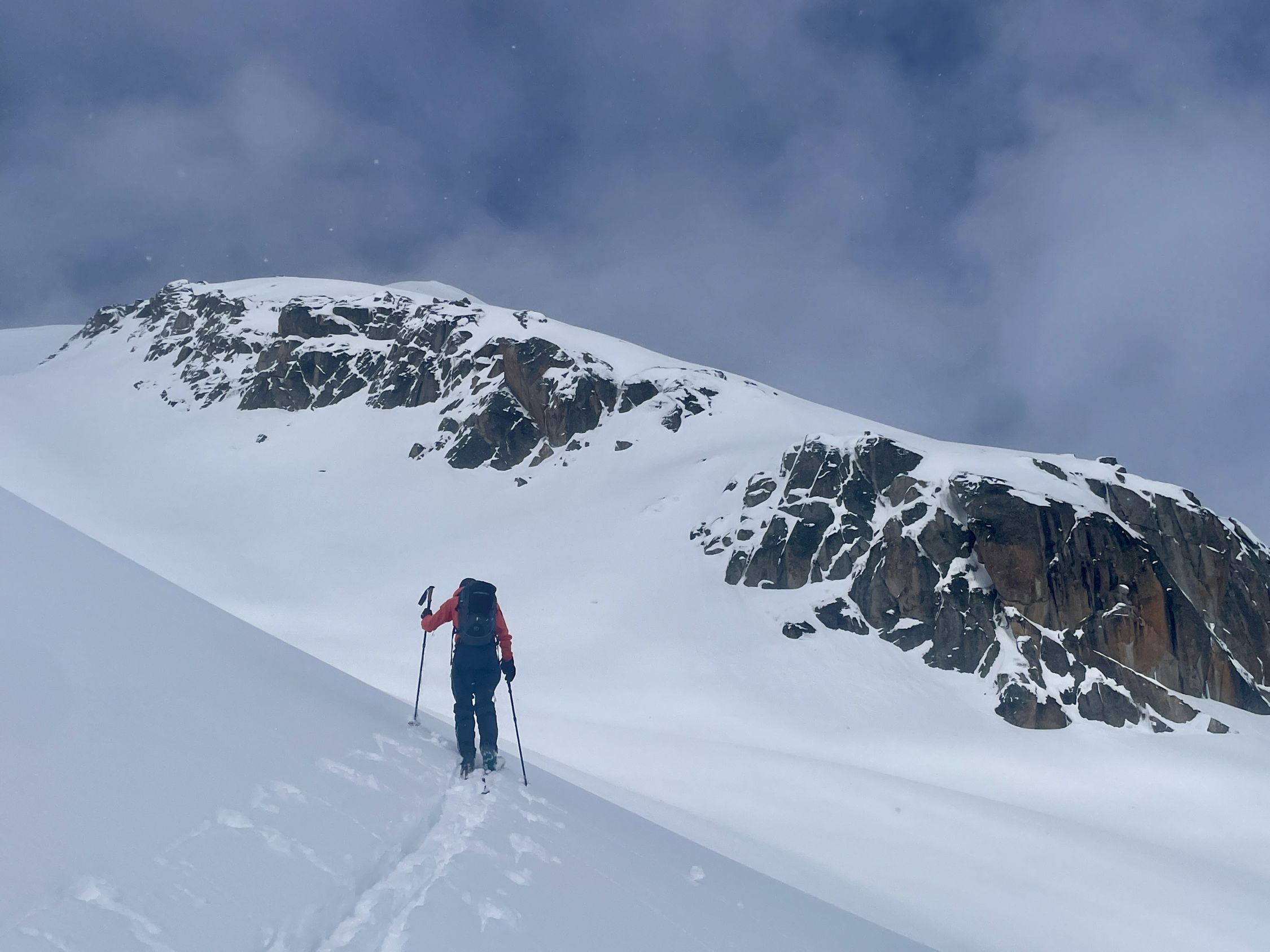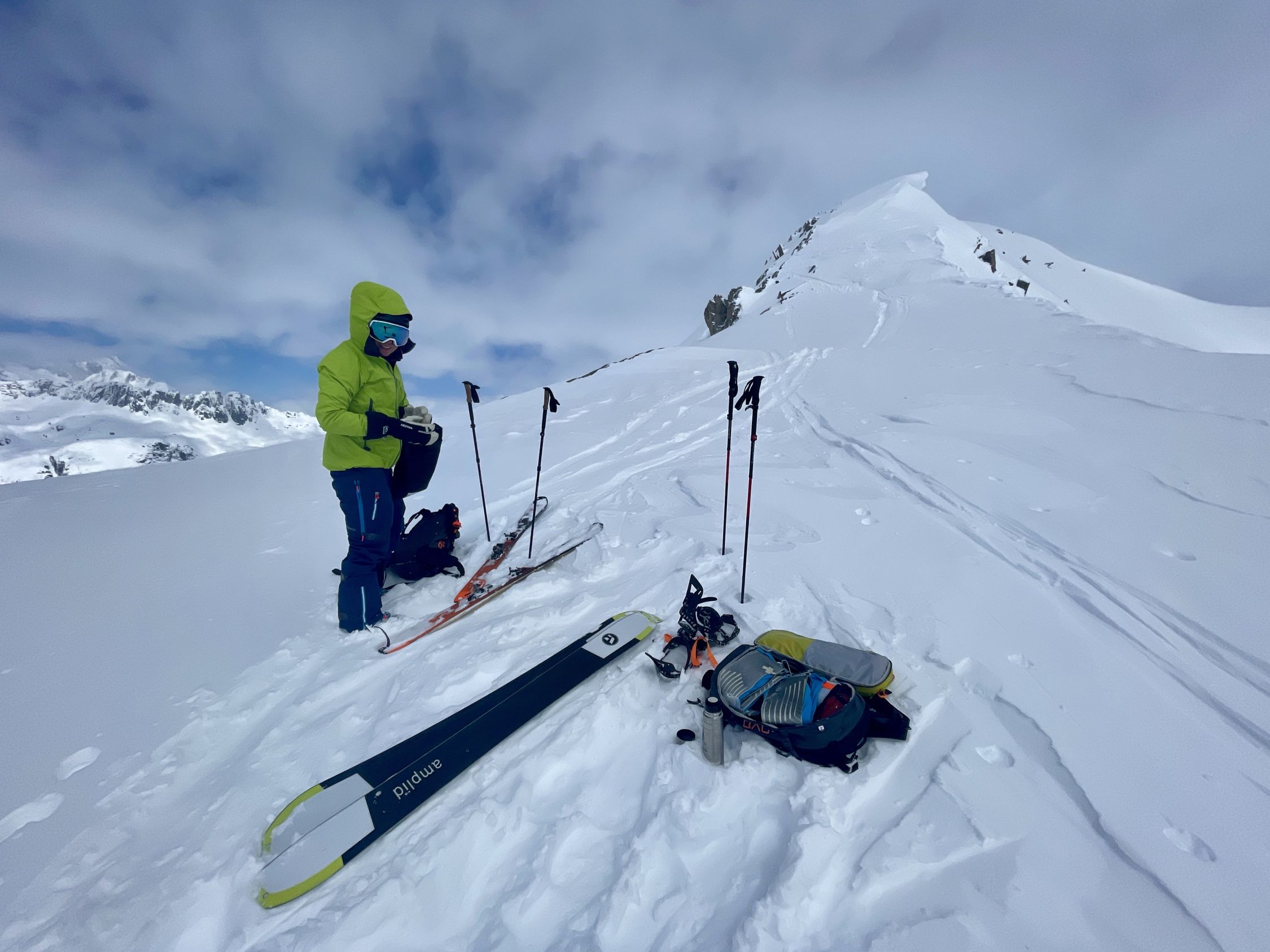 Schneemengen wie im Januar. Eine etwas komische Mischung zwischen Pulver und pappigem Nassschnee. Das Wetter war viel schlechter als prognostiziert; lange leichter Schneefall, fiese Bise, anstrengende Spurarbeit, oben am Grat starker Wind, welcher das Gipfelglück kurz vor dem Gipfel verhinderte. Der ganze Aufstieg war sehr schlechte Sicht, da die Hochbewölkung bis zuletzt vorhanden war. Die obere Hälfte war Abfahrtsmässig ziemlich gut, jedoch sehr "bremsige" Verhältnisse. Unten sehr weicher und schwerer Schnee, relativ mühsam. Bei der Abfahrt durch den Wald, einige Steinkontakte gehabt, daher die Bewertung. Ganz fies war, dass das Wetter erst im unteren Teil der Abfahrt aufklarte und dann richtig Sonnig wurde.