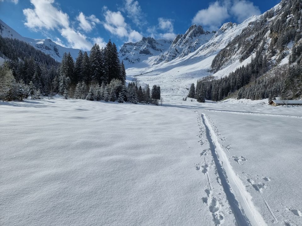 Start kurz vor neun Uhr beim Parkplatz bei -3°. Parkgebühr CHF 6.- in Münzen. Alles neu eingeschneit. Aufstieg Richtung Steibode bis zum Punkt 1557. Dort links halten, über den Bach und mit etwas Geknorze durch den Wald hoch bis Mittelberg. Weiter auf guter Spur über die SW-Flanke bis zum Skidepot, dank des vielen Neuschnees ganz weit oben. Gipfelaufstieg in guten Trittspuren. Rund vier Stunden inkl. Pausen. Die Abfahrt dann leider nicht wie erwartet ein Genuss, sondern harte Arbeit im tiefen und immer schwerer werdenden Neuschnee. Letzterer liegt z.T. auf einem nicht tragenden Deckel. Ab Mittelberg auf dem meist aperen Alpsträsschen, über die Brücke bei Punkt 1664, auf den Steibode und zurück zum Parkplatz.