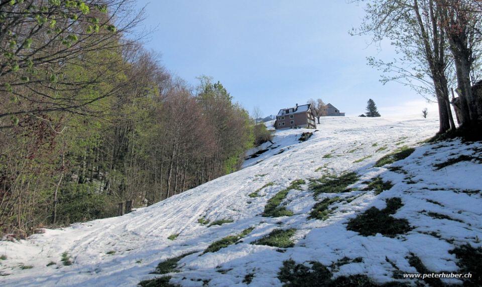 Abfahrt: Start um 11:30 Uhr. Der Gipfelhang war auf dem Südwest-Rücken schon schön aufgesulzt. Oberhalb Hüttlisboden noch weitgehend hart geforen und rupppig in den alten Spuren. Weiter unten wurde der Schnee rasch recht feucht und etwas klebrig. Auf der ebenen Unterlage gab es doch noch etliche schöne Sulzschwünge. Keine Steine erwischt, ganz unten sehr kurz etwas Graskontakt.