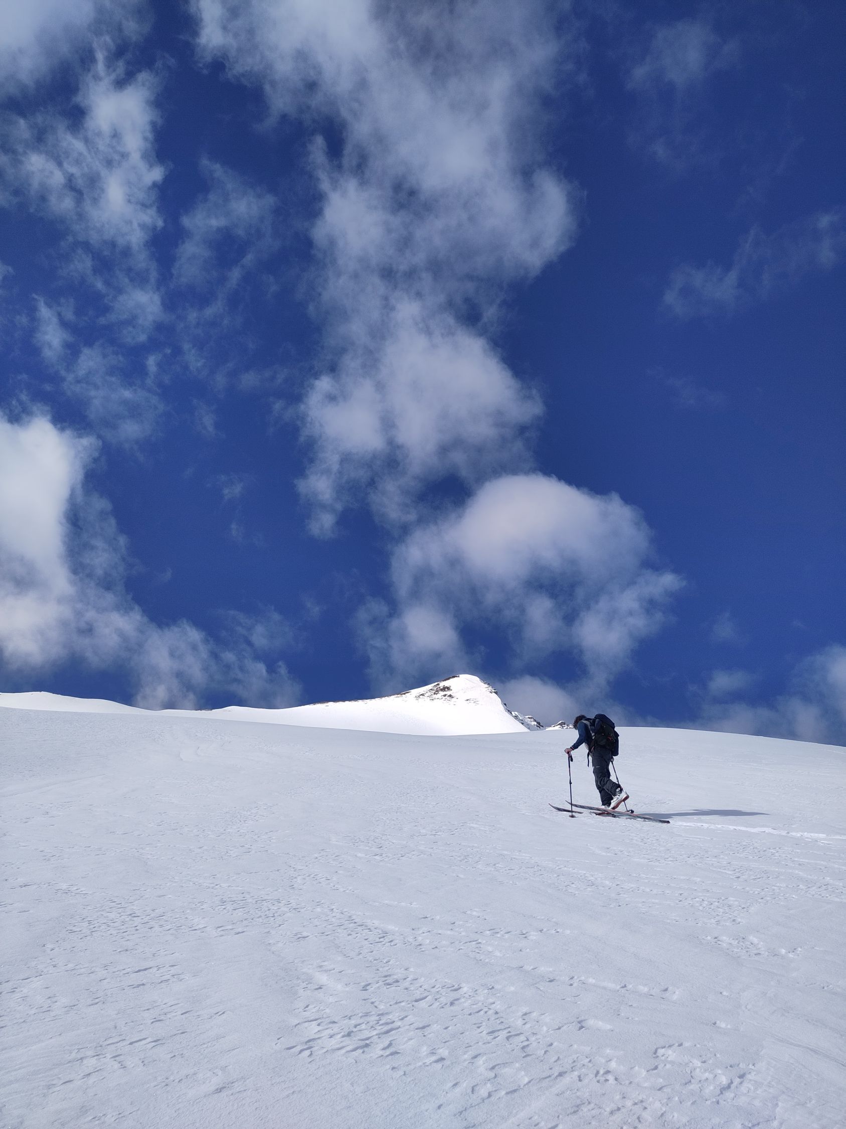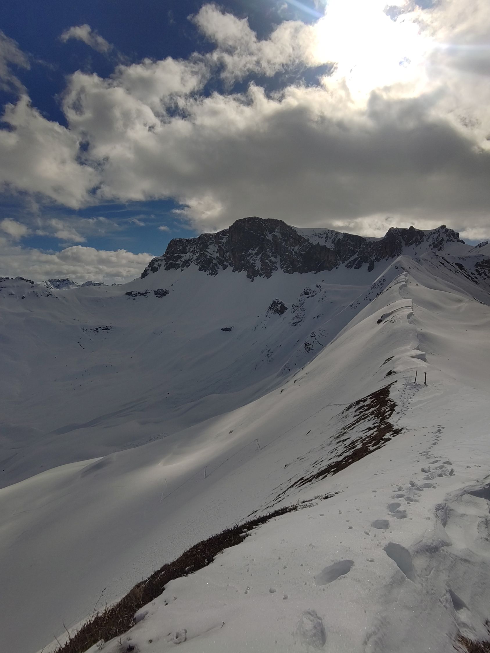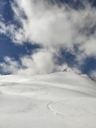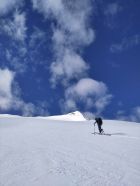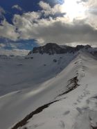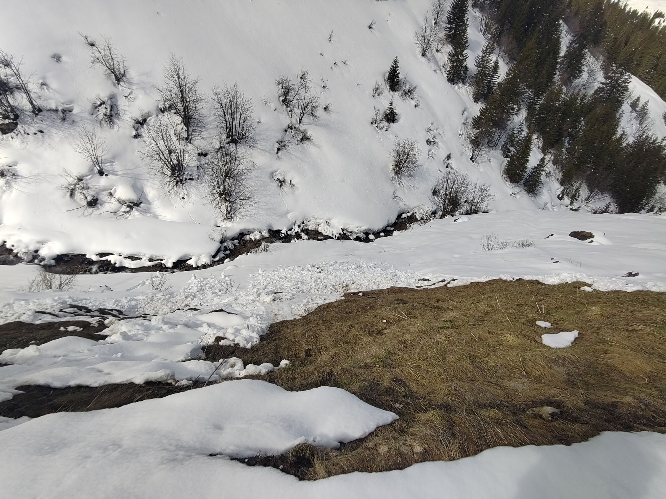 "Einziger" Sonnenfleck an diesem spätem April Wochenende. Unten teilweise wenig Schnee, oben teilweise tragender Deckel zum Teil Fahrerlebnis wie auf der Piste. Schneeprofil erstellt auf 2'781'878.75, 1'201'351.5 (2'161 m ü. M. Nordhang.) Die obersten 5cm waren gut tragender deckel, danach 50cm weiche Schicht gefolgt von einer gut gebundenen ca. 15cm harten Schicht. Darunter wieder weiches Profil. Boden nicht erreicht, da zu tief (ca. 2m)