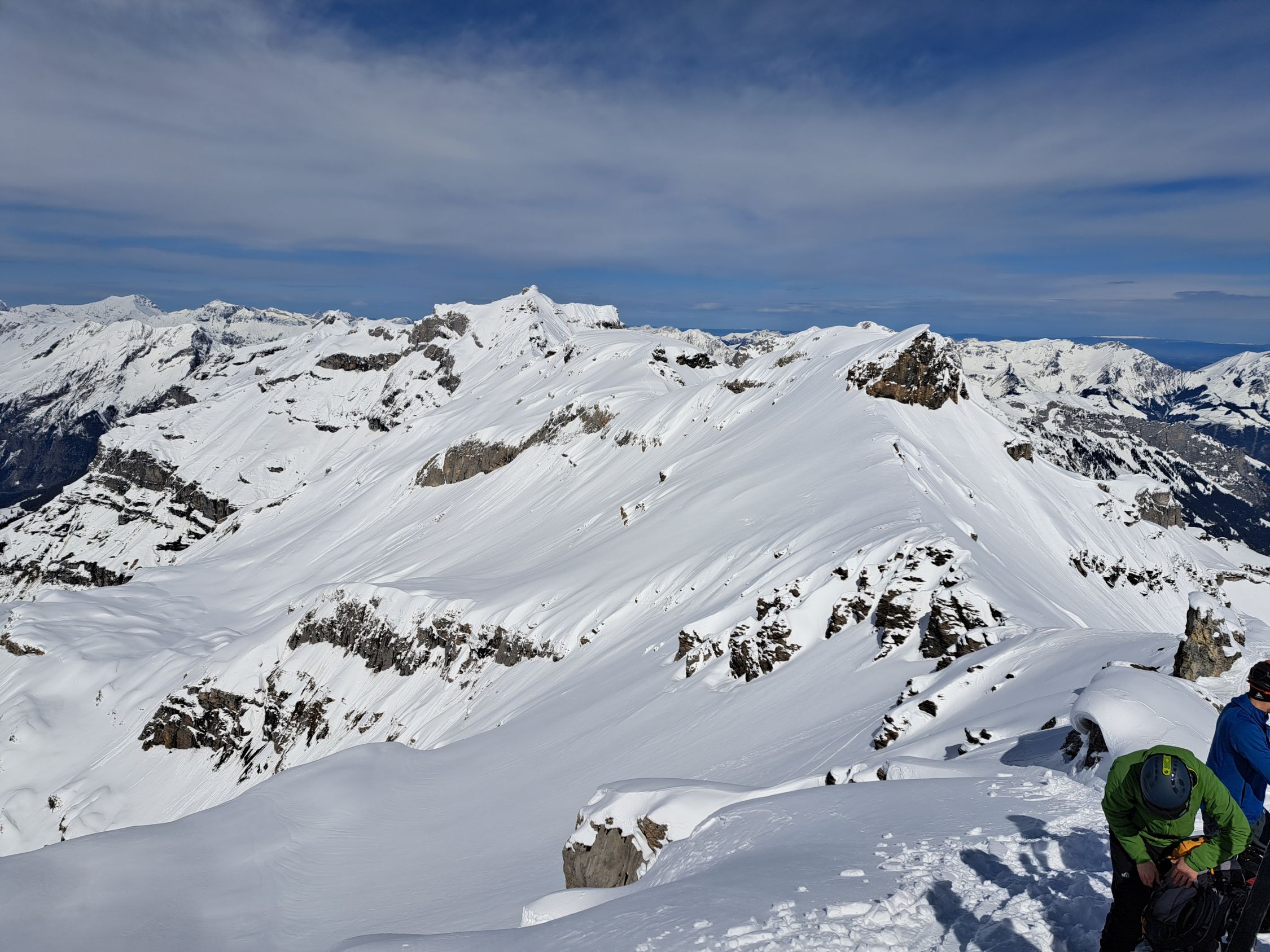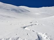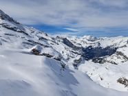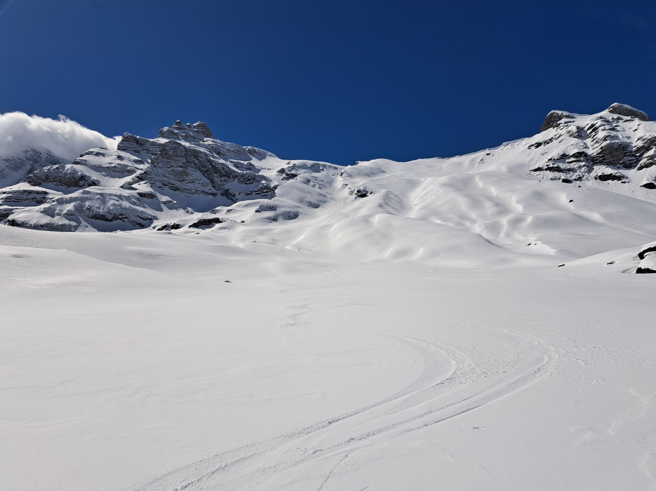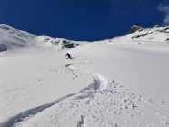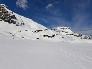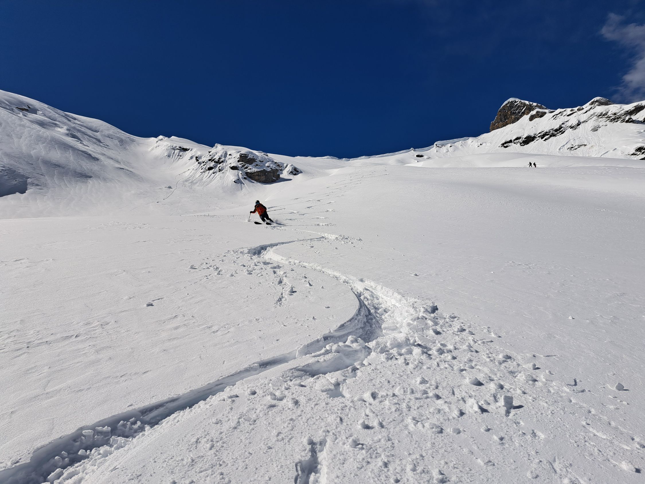 Abfahrt ganz zuoberst teils Winddeckel danach schöner Pulverschnee bis2200m und unterhalb bis 1800m tragend.