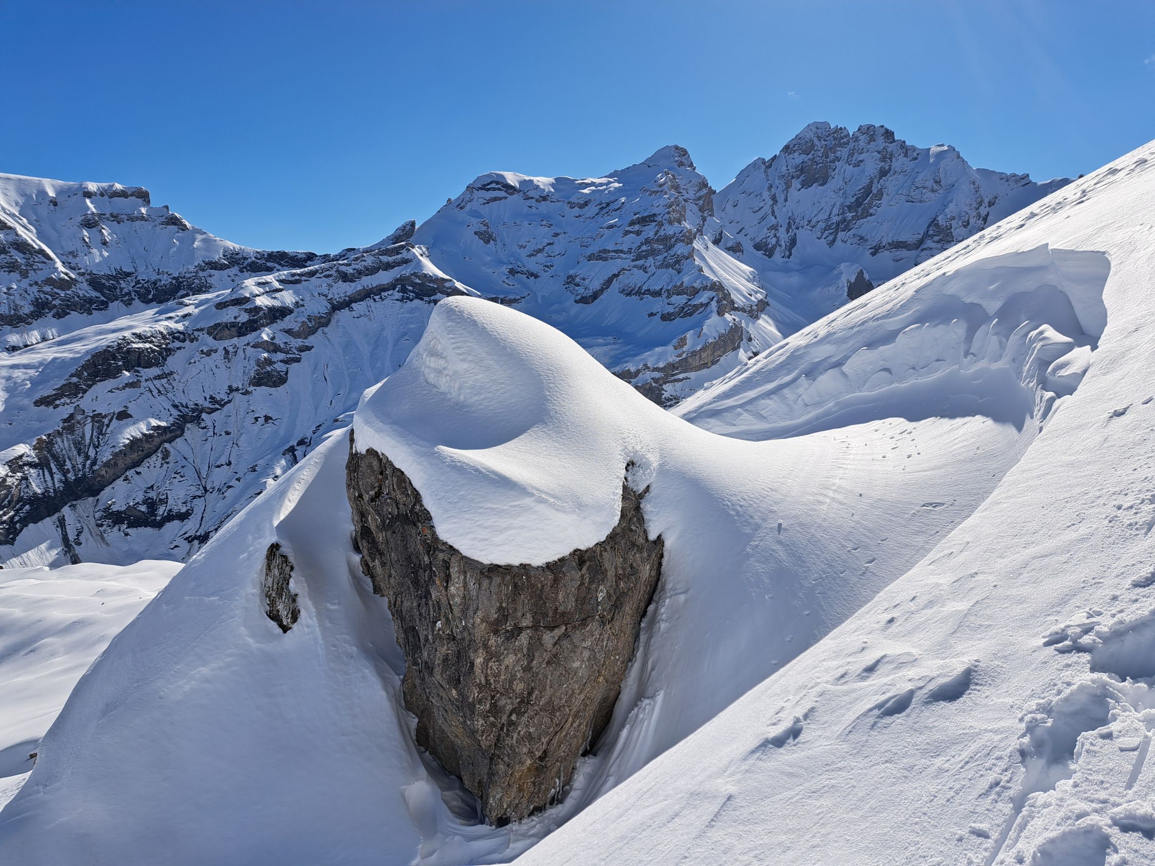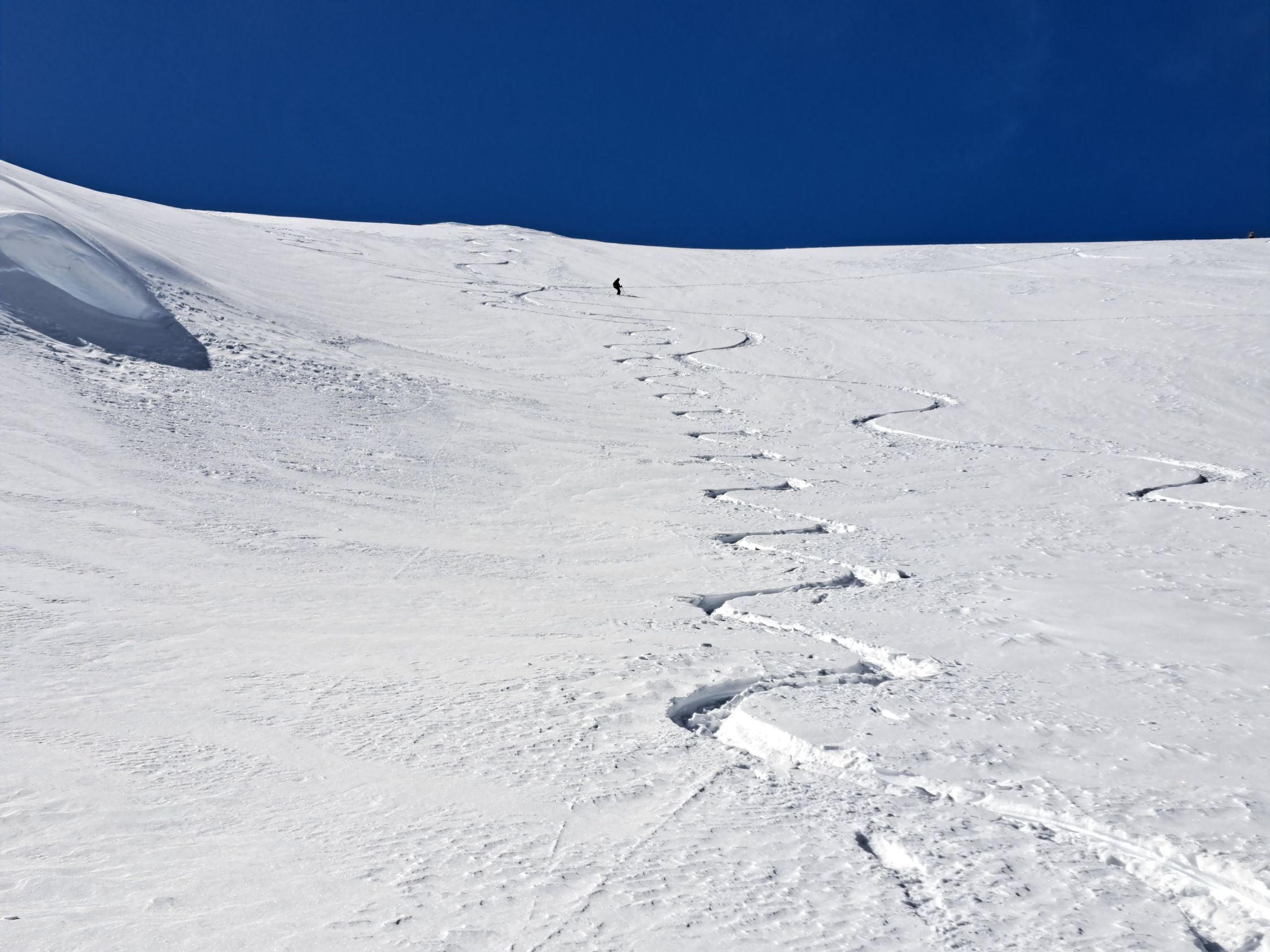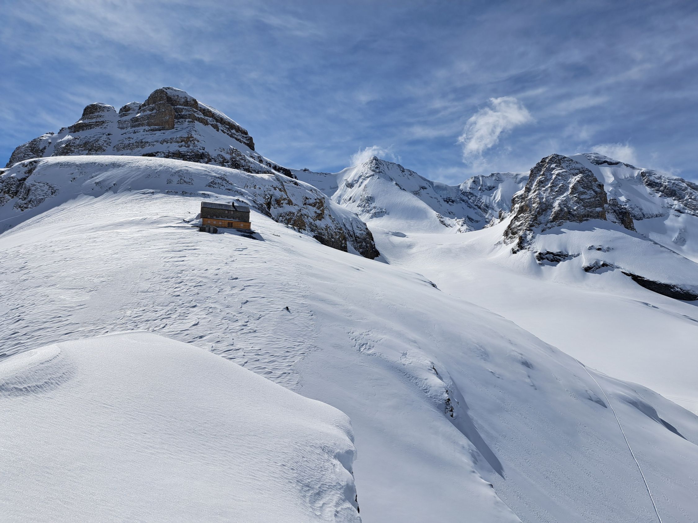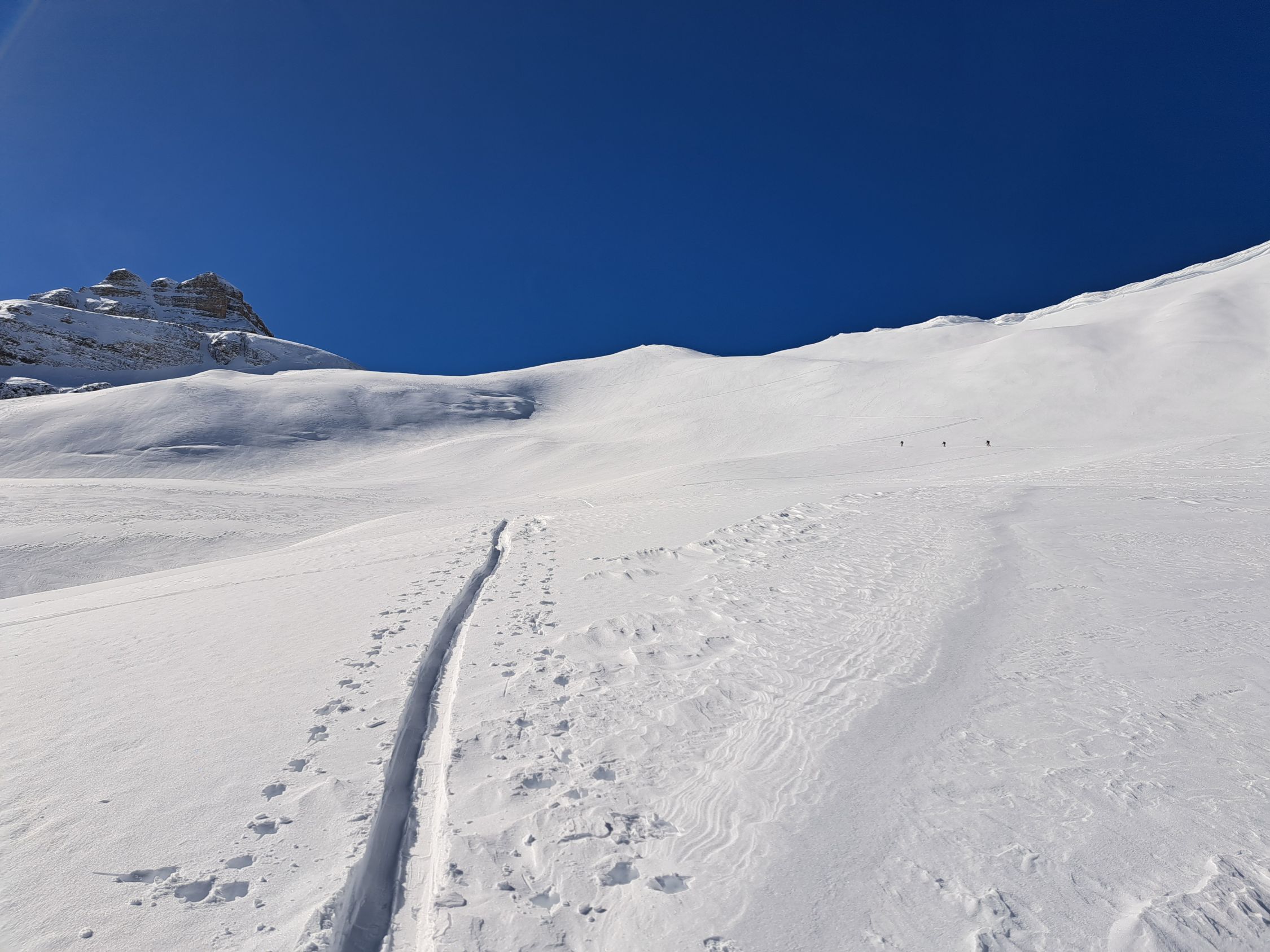 Abfahrt ganz zuoberst teils Winddeckel danach schöner Pulverschnee bis2200m und unterhalb bis 1800m tragend.