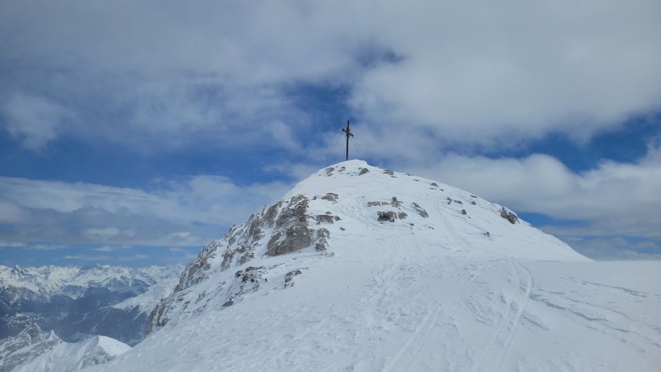 In guter wenn auch teilweise zugewehter Spur bis zu Gipfelkreuz. Starker Sturm daher kalt. Abfahrt oben Bruchharst, weiter unten nass.