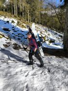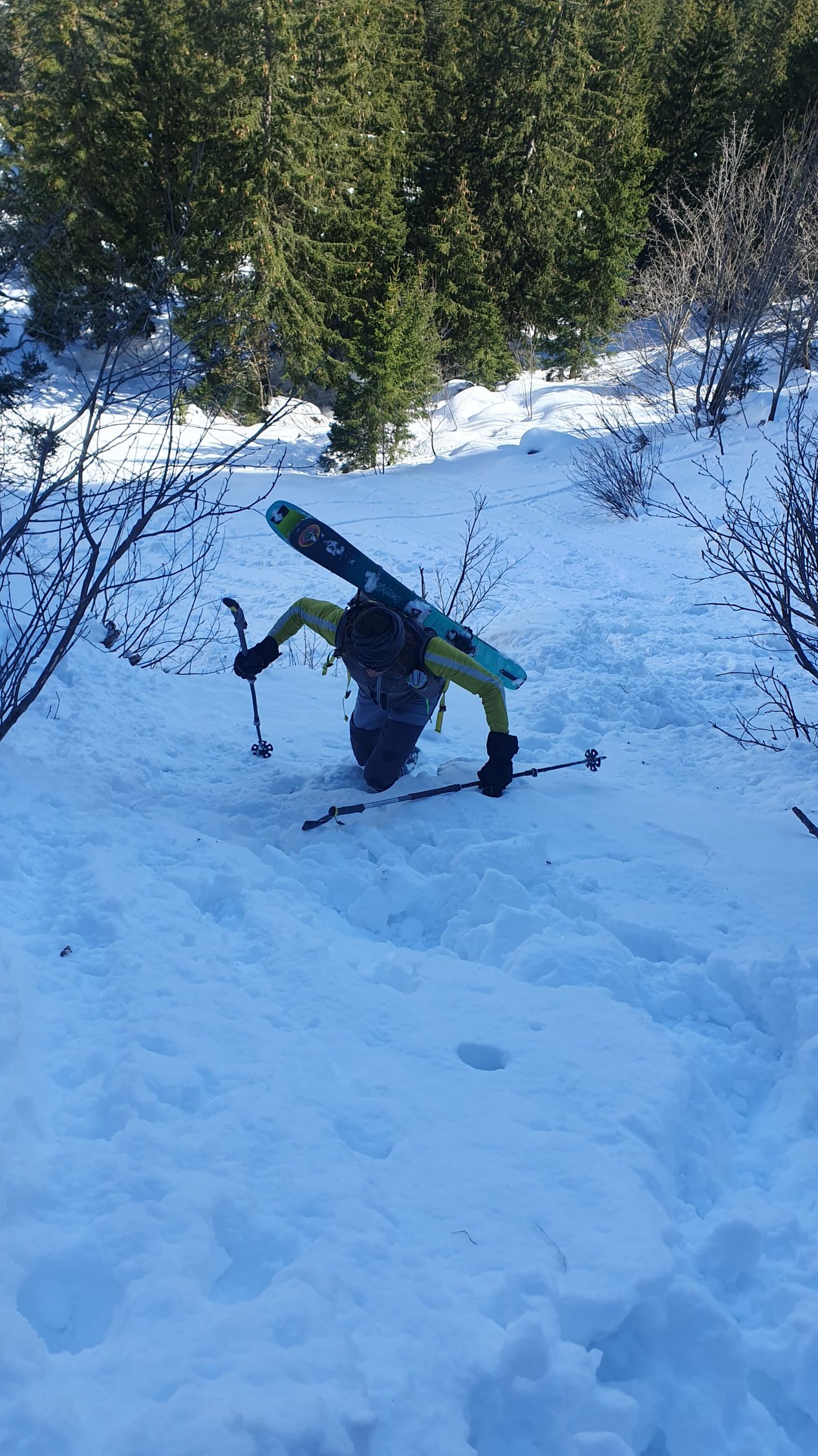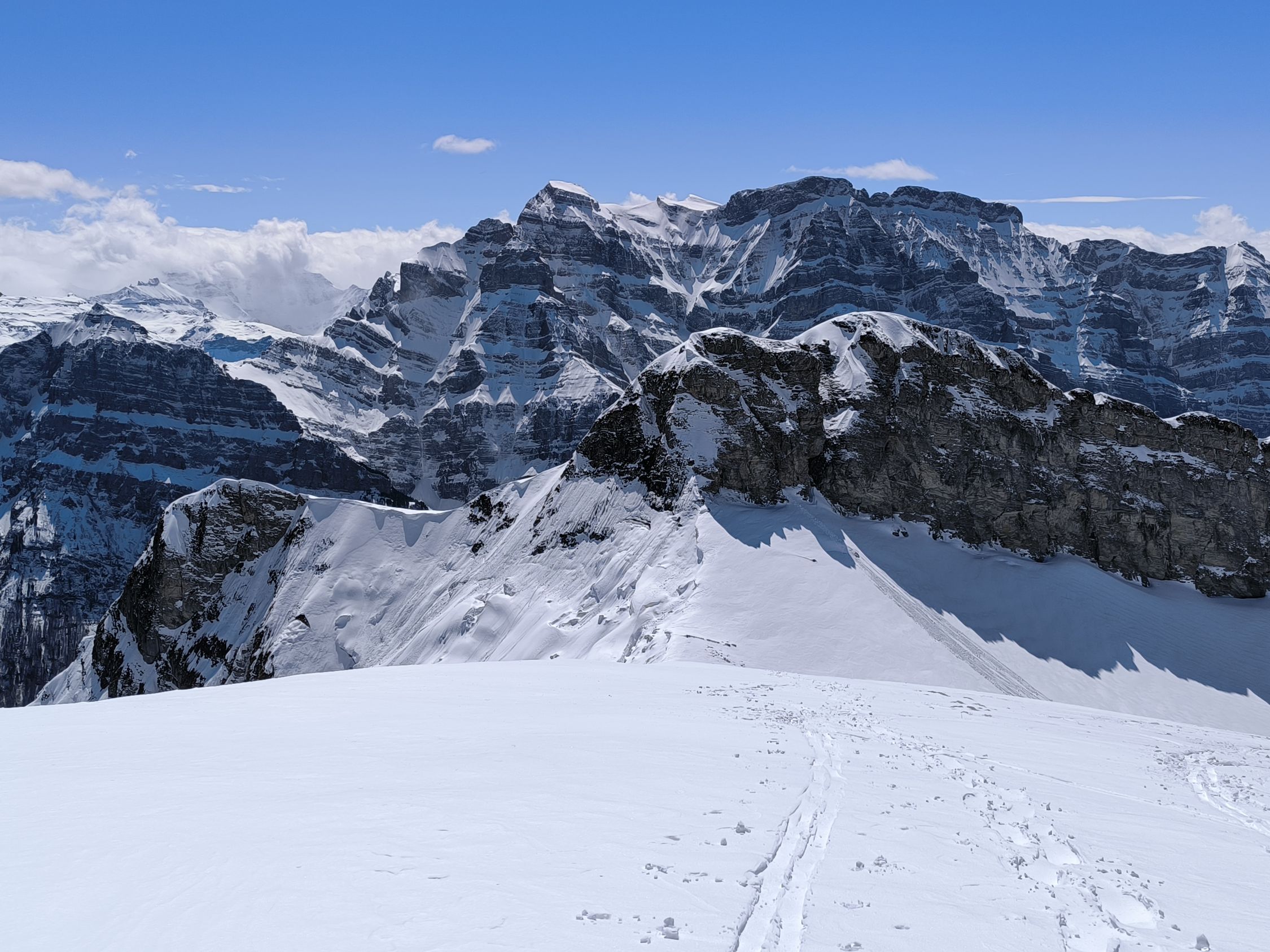 Start um 8:30 mit 15 minütigen Fußmarsch bevor die Ski endgültig ihre eigentliche Aufgabe erfüllten. Der Tritt machte seinen Namen alle Ehre. Guter Trittschnee der ohne Steigeisen schnell gemacht war. Danach landschaftlicher schöner Aufstieg bis zum Gipfel. Die Föhnwalze beim Hausstock war imposant. Der Wind am Mittag war im Rahmen, so dass die Aussicht und die Tiefblicke ausgiebig genossen werden konnte. Abfahrt teilweise im Bruchharsch ansonsten weicher Schnee unten Bremsschnee.