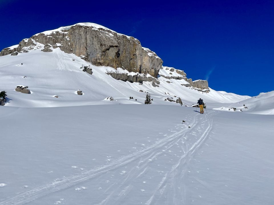 Im Aufstieg griffiger, noch harter Schnee. In der Scharte hoch zum Ifen dank Vorarbeit Anderer guter Trittschnee und damit aktuell vollkommen problemlos hoch wie runter. An der Scharte jedoch nicht zu früh und vor der Trittspur abschnallen; man versinkt bis in den Schritt und das Wühlen ist echt mühsam.
