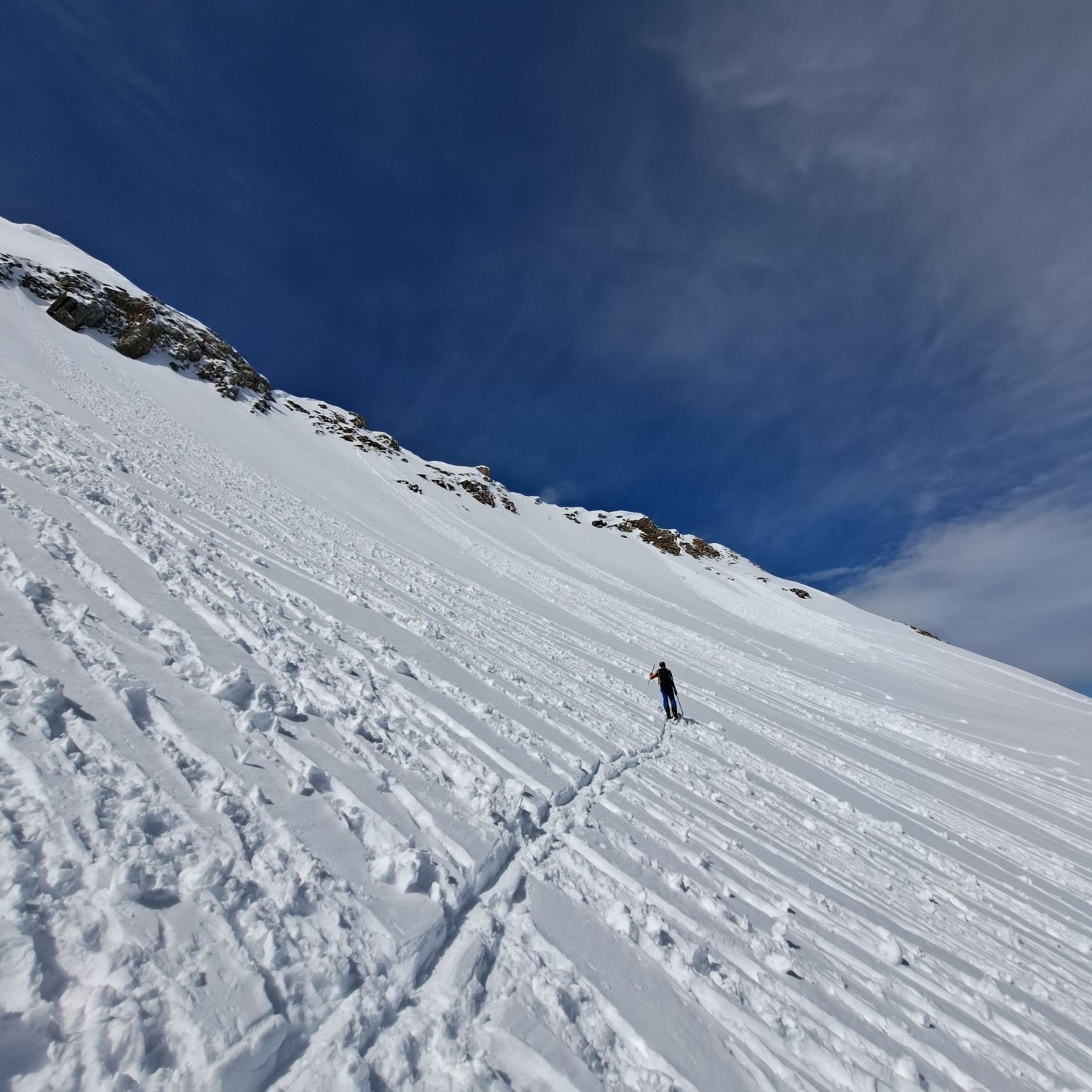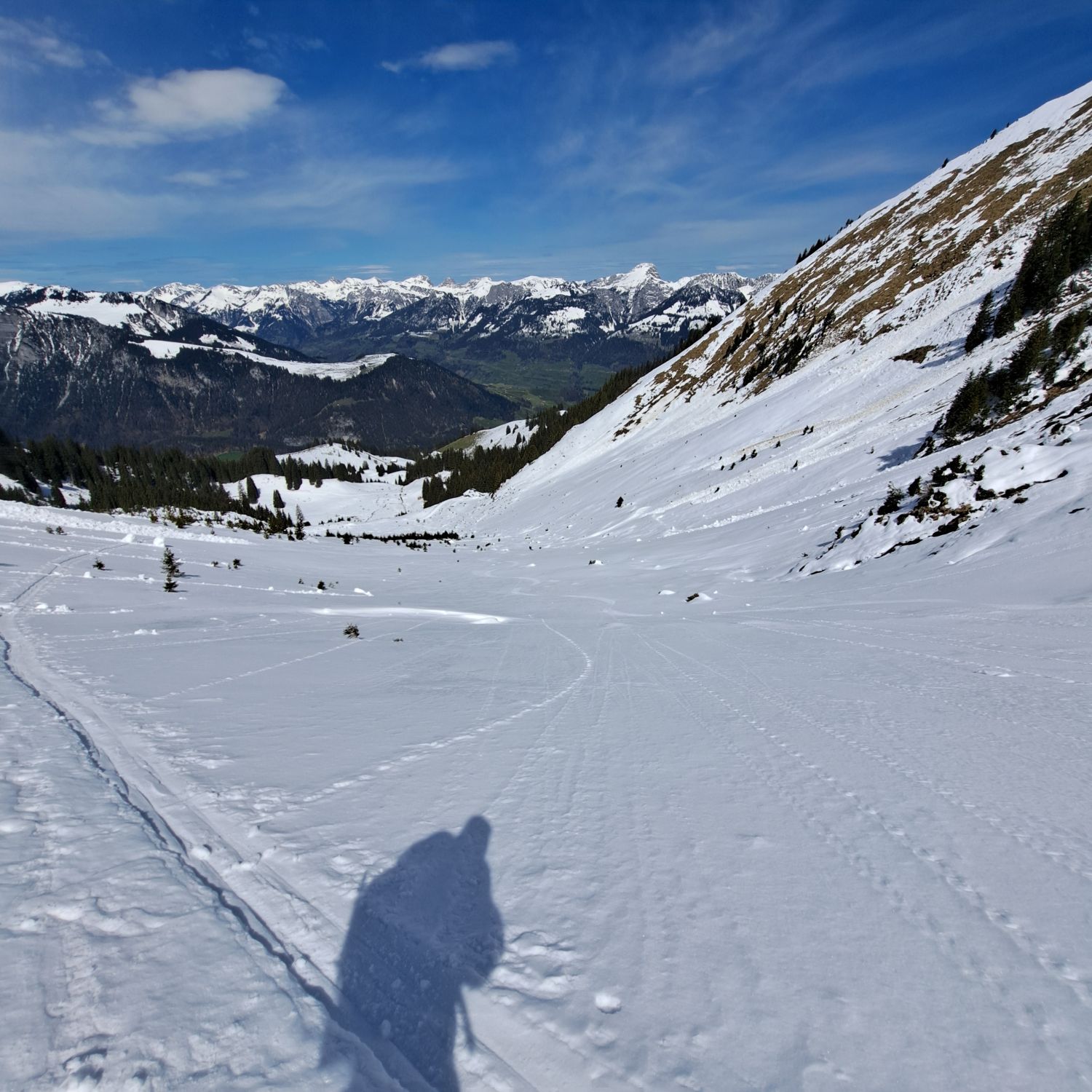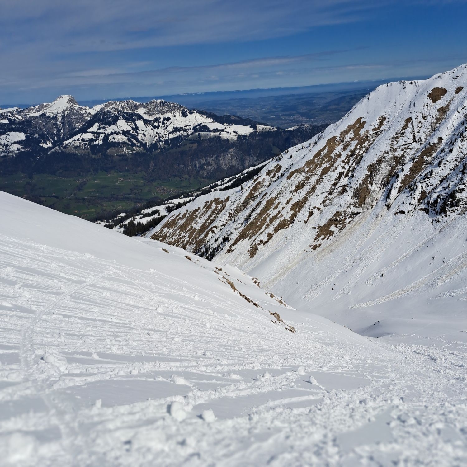 Sind ab Springenboden noch hochgefahren bis Alp Bergli.1 und 2 Steilhang noch gut mit Skis machbar.Ab unter Nitzel gefrohren tragend,Gipfelhang rechts um 11.30 bereits aufgesulzt.Abfahrt über rechte Schulter Sulz,Nitzel tragend mit Sülzchen,Waldabfahrt bereits nass,chnüblig,Schnee bis PW.