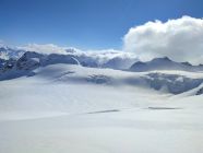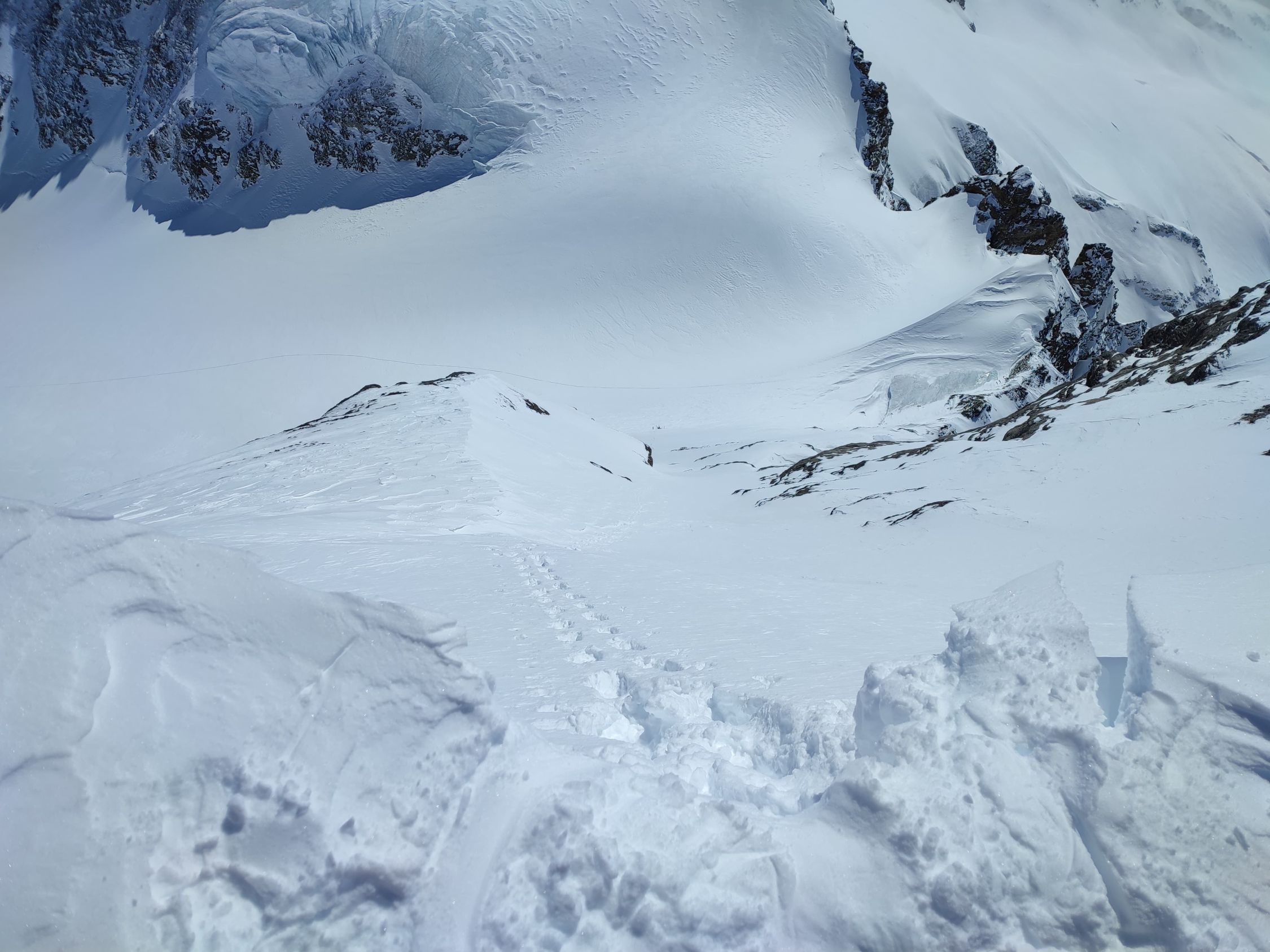 Gletscher ab Biwak dürfte noch einige Wochen hervorragend gedeckt sein. In den untersten Passagen bis ca. 1500m muss man wohl schon diese Woche die Skier tragen und die Abfahrtsvariante über die Platten wird wohl auch bald mit ein paar Mal Ski an- und abziehen verbunden sein.