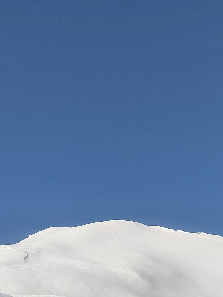 Schnee hatt gut angezogen oben gepresster, pulvriger und unverfahrener Gipfelhang.