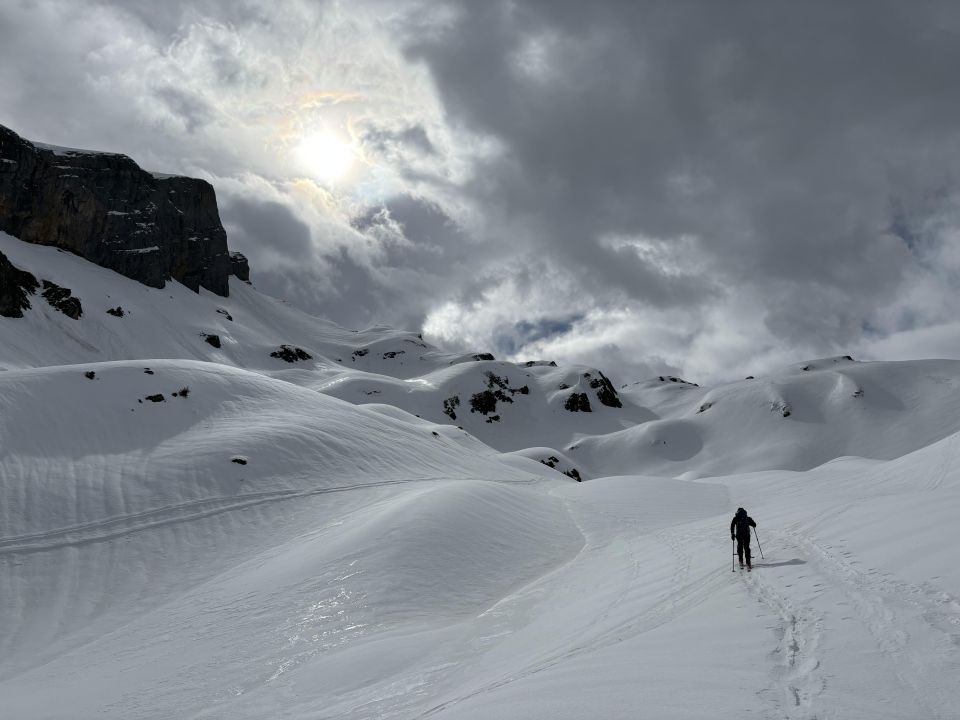 Aufgrund der Erwartung von ziemlich viel Bewölkung und starkem Föhn ausgezeichnet - die meiste Zeit wars sonnig und der Föhn wehte nur ab und zu schwach. Im Aufstieg zuerst tiefer Nassschnee, weiter oben einen teils tragenden Deckel. Fussaufstieg ging super mit Steigeisen und Pickel. Seil und Kette teils eingeschneit. Haben uns dann spontan entschieden, von der Lücke nach Nordosten runter zu fahren, mit der Hoffnung auf besseren Schnee. Den haben wir nicht gefunden, aber für Ende April trotzdem ein paar gute Schwünge. Schneelage ist top bis zur Talstation runter, unten eine etwas heikle Bachquerung, die viel Schmelzwasser führte. Wir waren fast die einzigen im Gebiet.