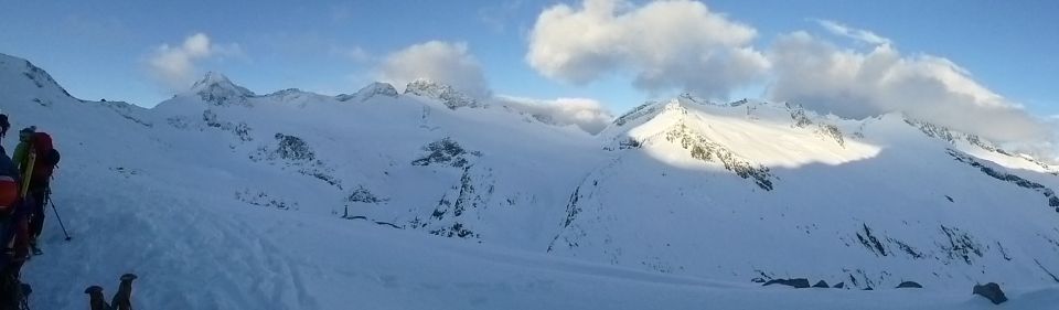 Abstieg von der Kürsinger Hütte am 3. Tag ab 06:40 Uhr bei -2°C unter bedecktem Himmel und bei noch heftigerem Südföhn (angeblich bis 100 km/h im Gipfelbereich). Etliche Tourengänger verzichteten wohl auf den Aufstieg.