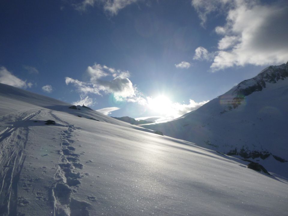 Wir liefen die obere Route (lange Traverse oberhalb des Sommerweges ohne Gletscherberührung) bei geringster Lawinenwarnstufe und unangeseilt bis Zwischentörl und so weiter bis zum Gipfel. Evtl. Spalten danach im (in Aufstiegsrichtung gesehenen) linken Gletscherbereich waren reichlich geschlossen und massiv mit Schneeauflage überdeckt. Von Hopffeldboden zum Gipfel und zurück sind wir die fast 50 km hin und zurück gelaufen, also ohne Taxi, was mit schneeschuhtauglichen Bergschuhen machbar ist im Gegensatz zu Skischuhen. Schade, dass wir nicht unsere Velos dabei hatten. Einige Skitourengänger fuhren damit hinauf bis zur Aschalm, bzw. weiter bis zur Bergwachthütte. Damit würde man sich 8 oder 9 km Fußweg sparen.