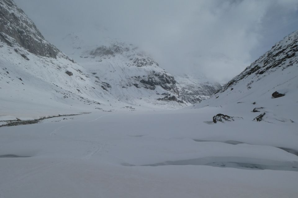 In Zervreila ab Parkplatz bei der Staumauer noch viel Schnee, unterwegs dem See entlang im Bereich der Kanalbrücke dann erste kurze Tragpassagen. Ab Ochsenstafel am Ende des Sees auf der Winterseite über die Lampertschalp wieder geschlossene Schneedecke und gegen die Hütte hin viel Altschnee mit etwas Neuschnee überdeckt. Die Querungen des Valser-Rheins in der Länta ist an zahlreichen Stellen über solide Schneebrücken möglich. Am Stausee durchfeuchtete, in der Länta mit dem Temperaturrückgang stabile Schneedecke mit 5 cm Neuschnee.