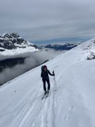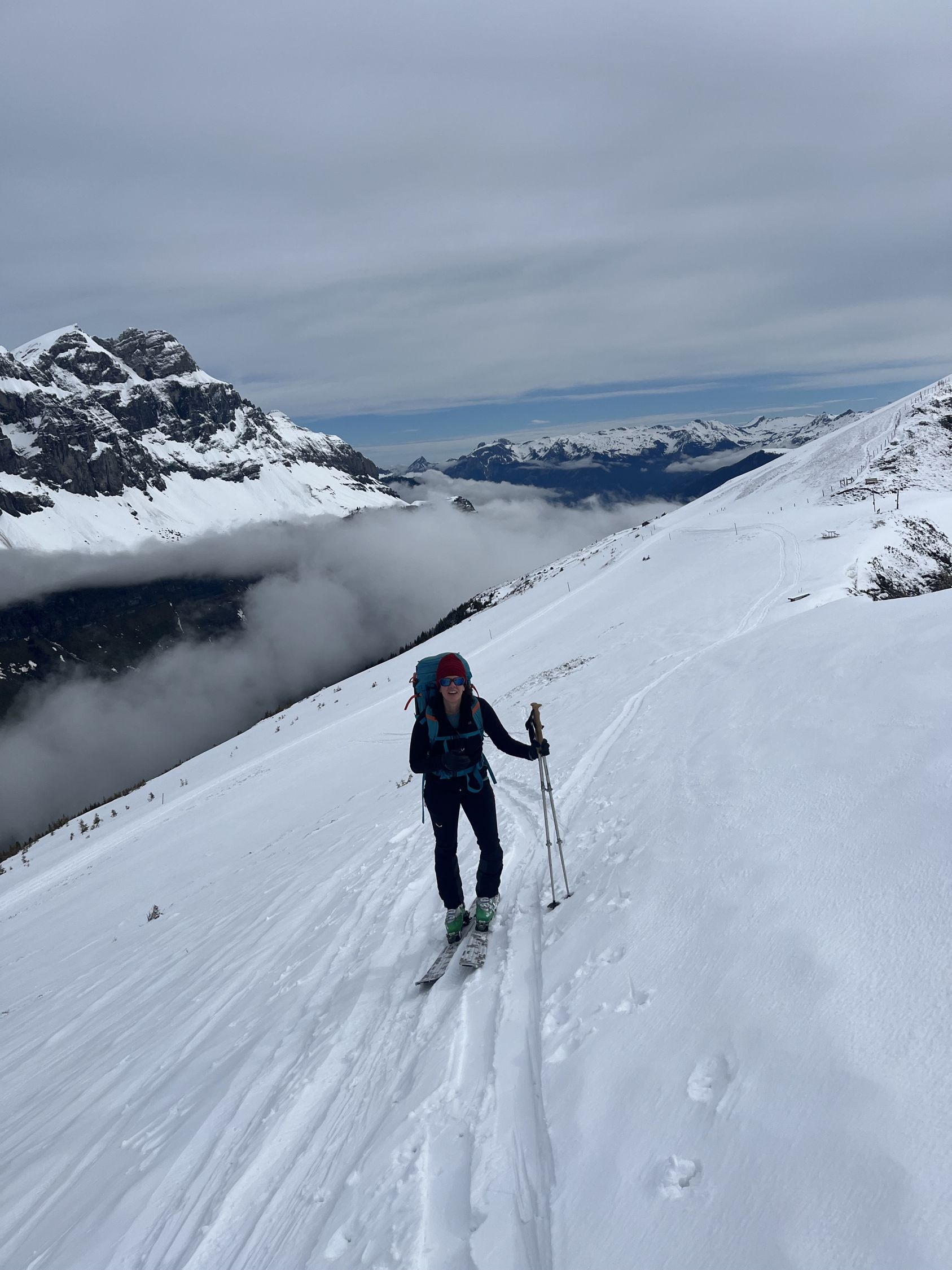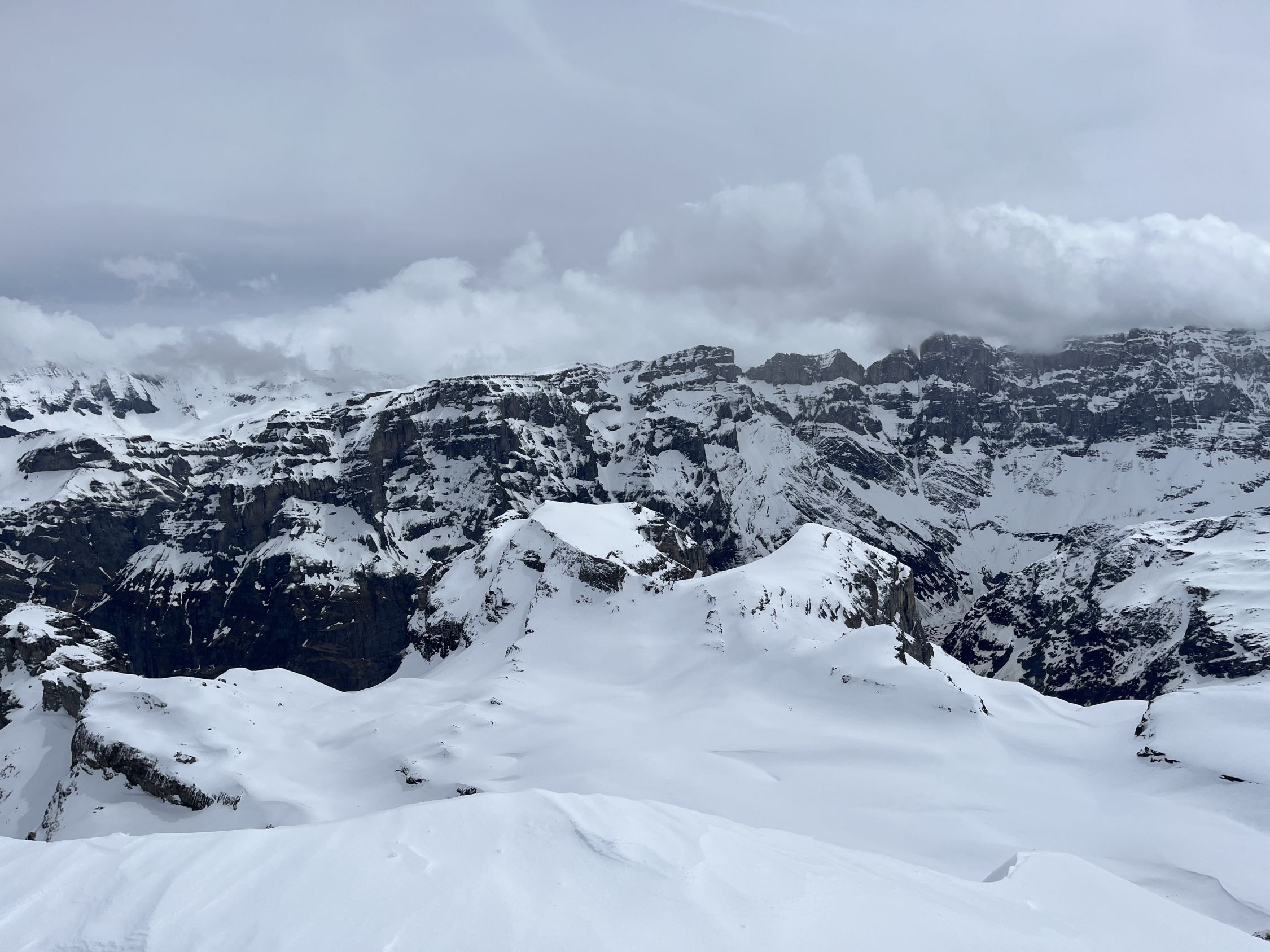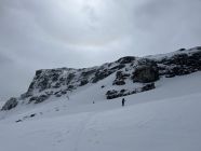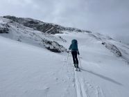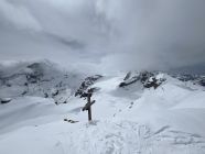 Start um 10:00, gute Sicht, bis zum Gipfel immer wieder Windböen, sonst Powderflaum auf griffiger unterlage, Nähe Gondelstation wenig Schnee.