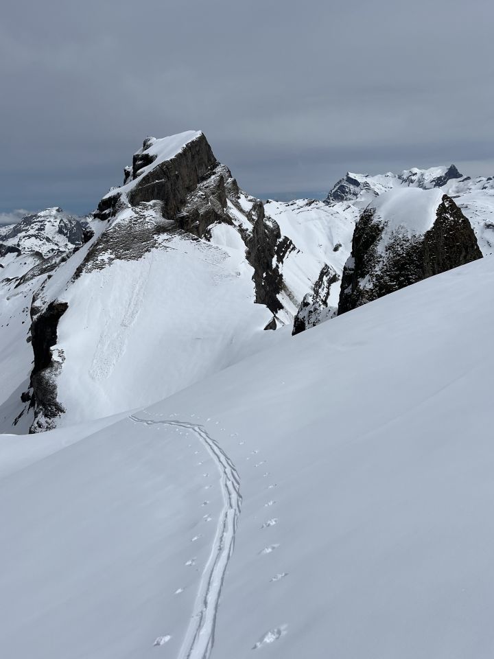 Perfekter Trittschnee in der steilen Druesberg NW-Flanke.