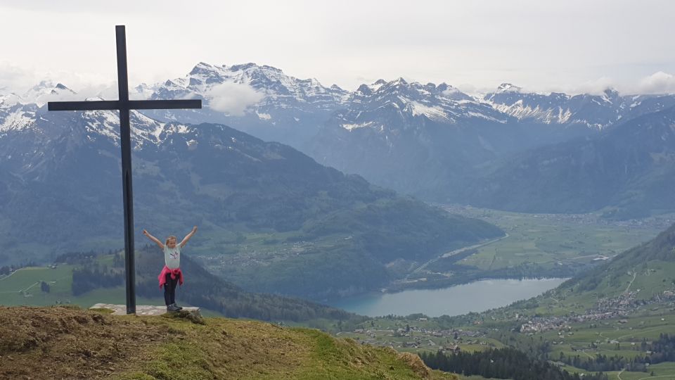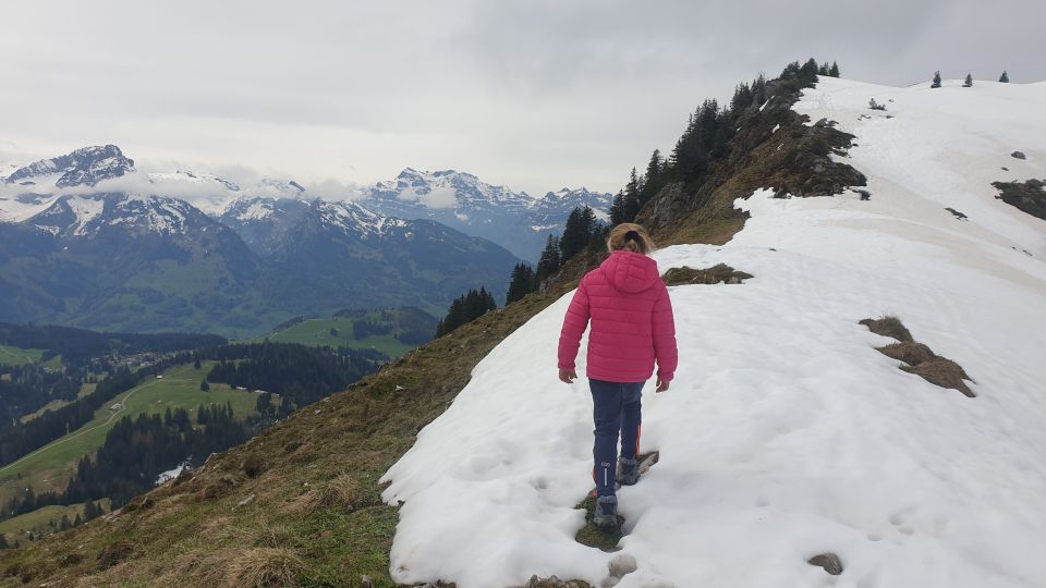 Am Gipfel noch etwas Schnee, der gespurt war. Vom Gipfelkreuz führt der Weg schneefrei südwestlich nach Hüttlisbode