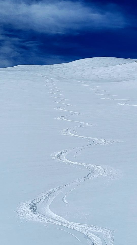 Starker Südwestwind, am Gipfel stürmisch. Abfahrt abschnittsweise mit schönem Pulver, abwechselnd mit harten aber griffigen Stellen. Unterhalb 2000m um die Mittagszeit zunehmend nasser Bremsschnee.