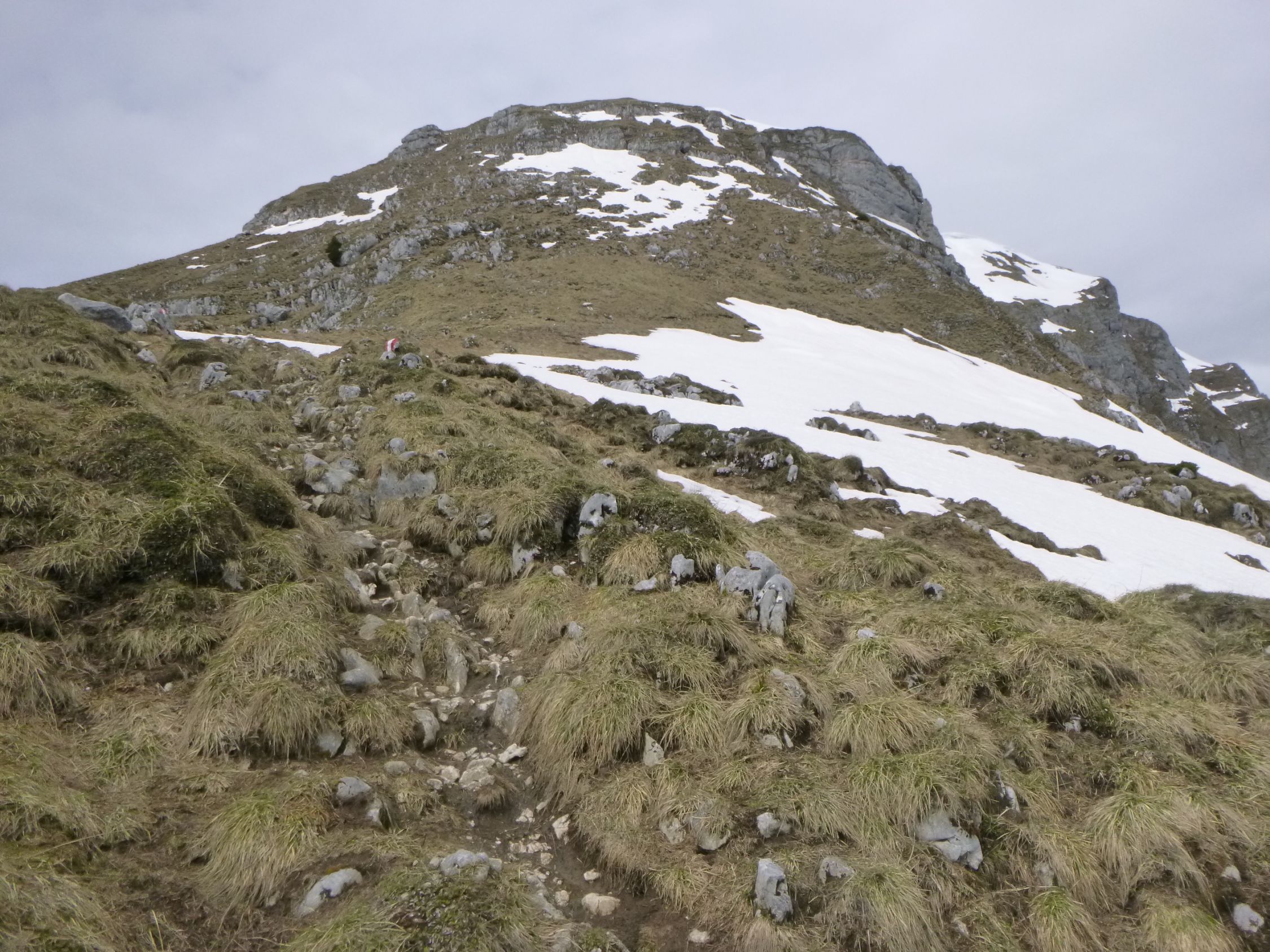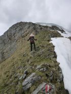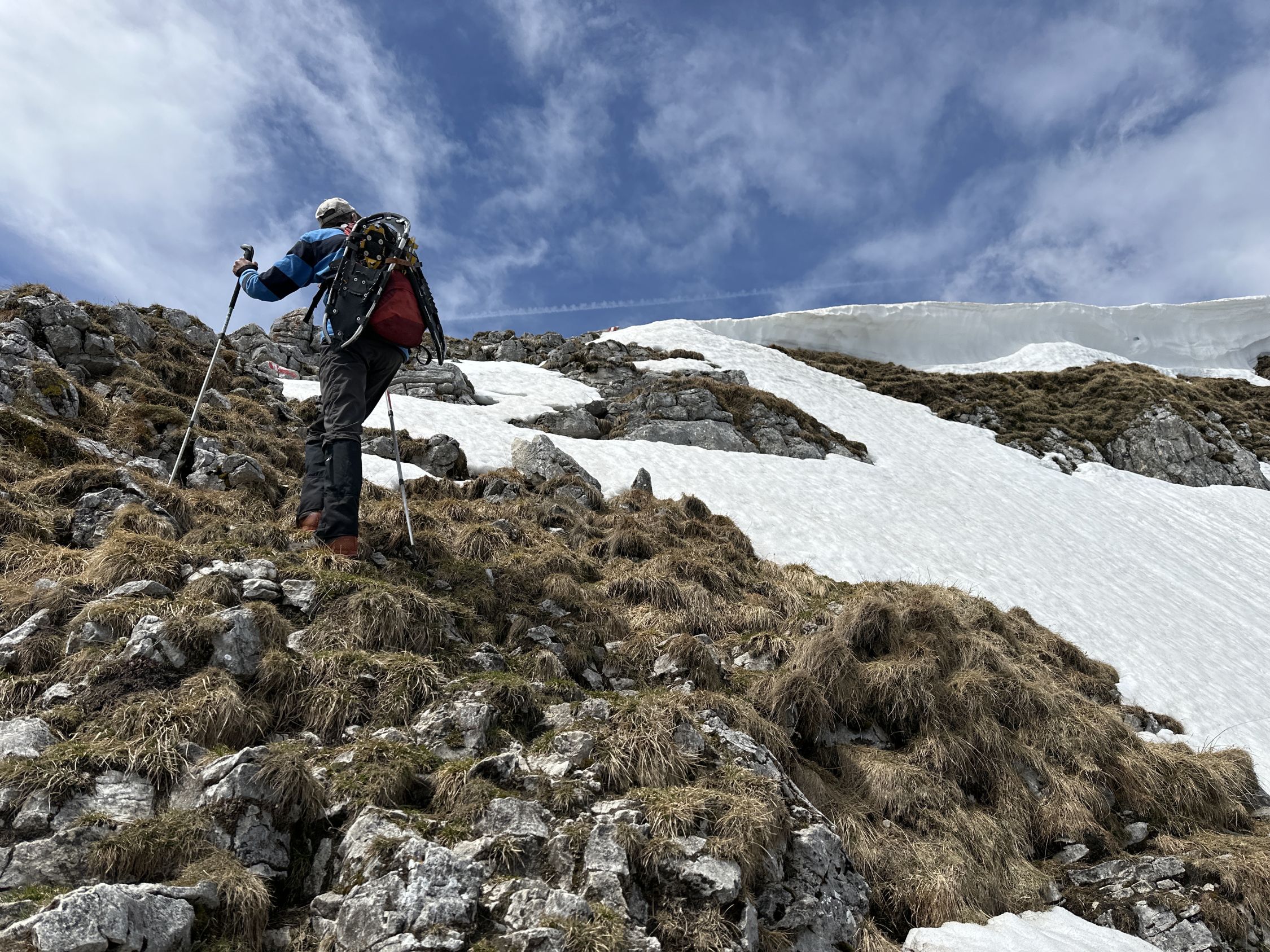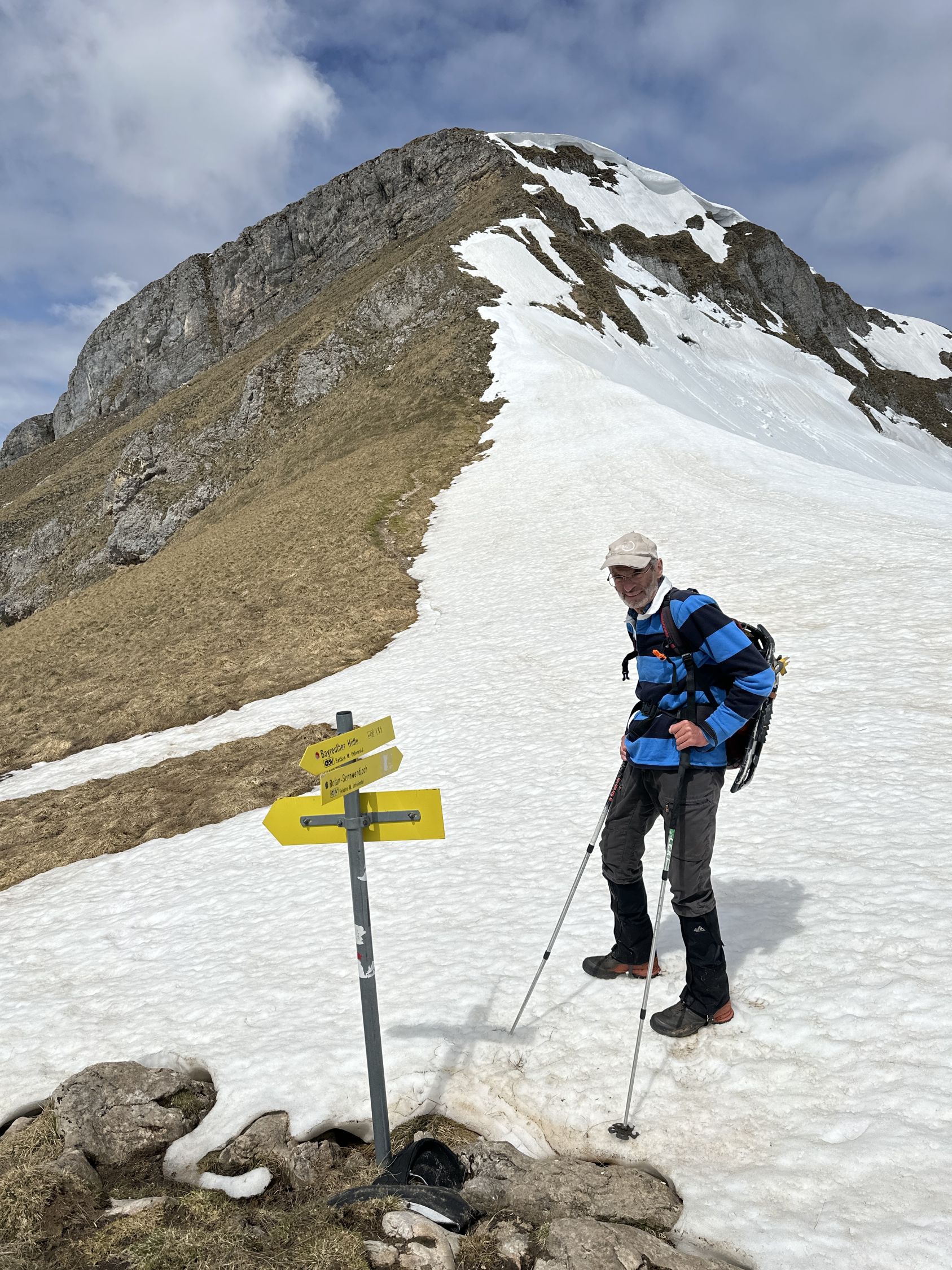 Tourenbeginn um 07:20 Uhr bei 8°C unter dünnen Schichtwolken am Himmel. Oberhalb der Bayreuther Hütte gibt es noch einige Schneefelder, welche wir mit Schneeschuhen querten, weil wir diese dabei hatten. Wäre aber auch ohne gegangen, da fester Trittschnee vorhanden war, ohne zu tief einzusinken. Entgegen der Wetterprognose zogen keine Regenwolken auf, sondern kam zeitweise gar die Sonne durch.