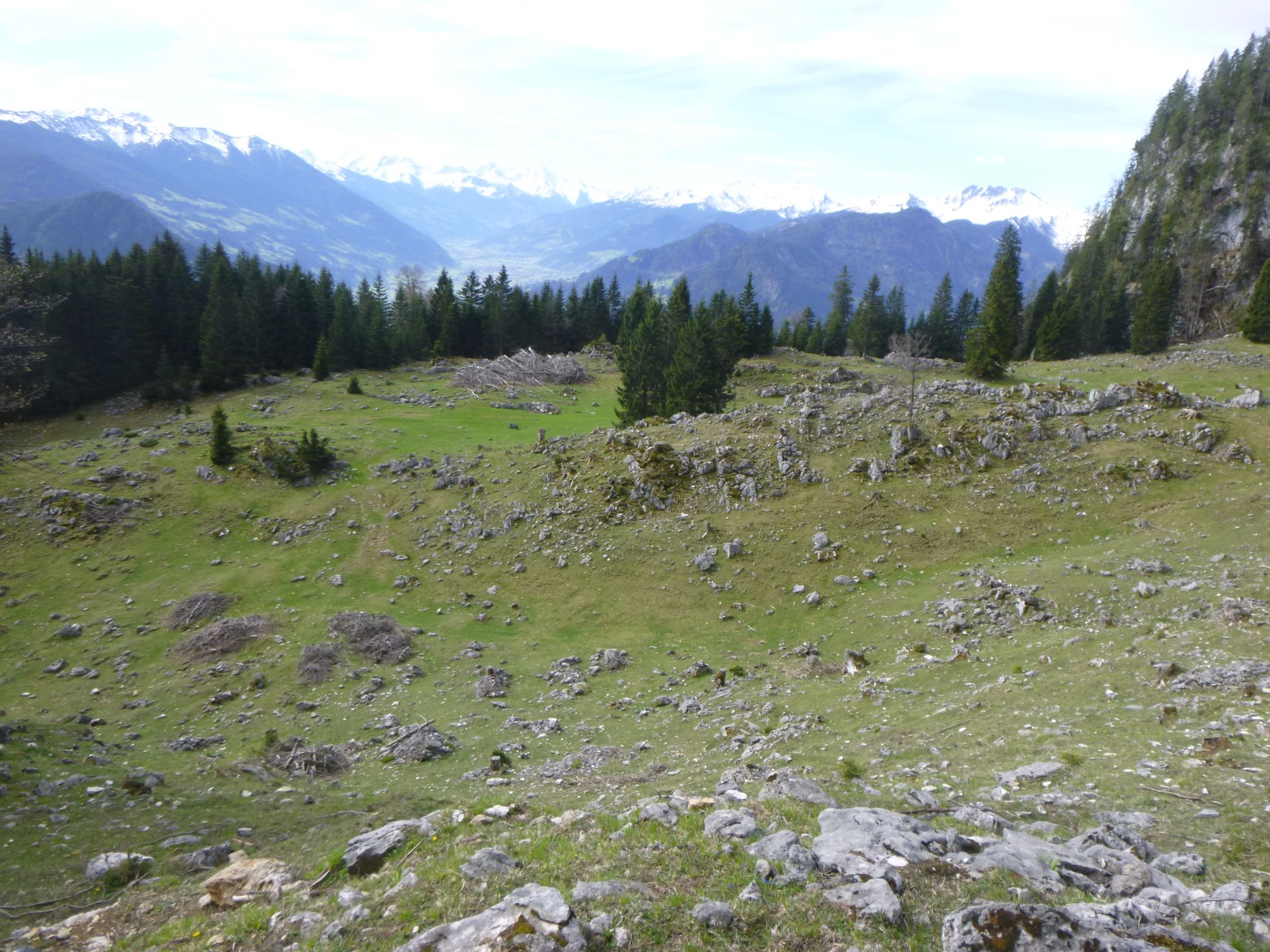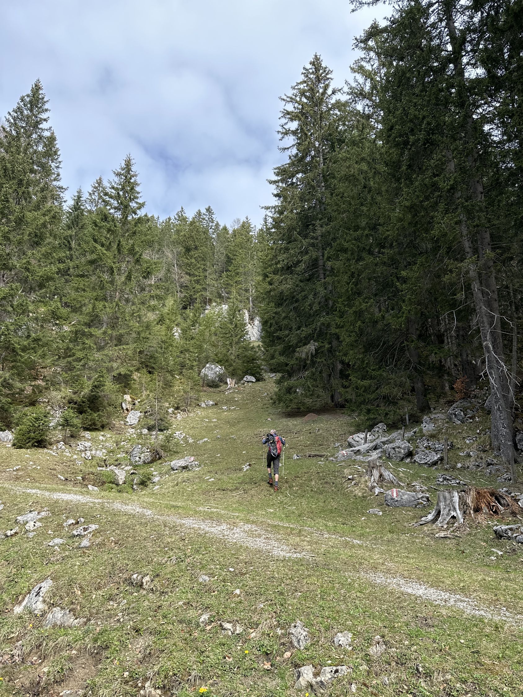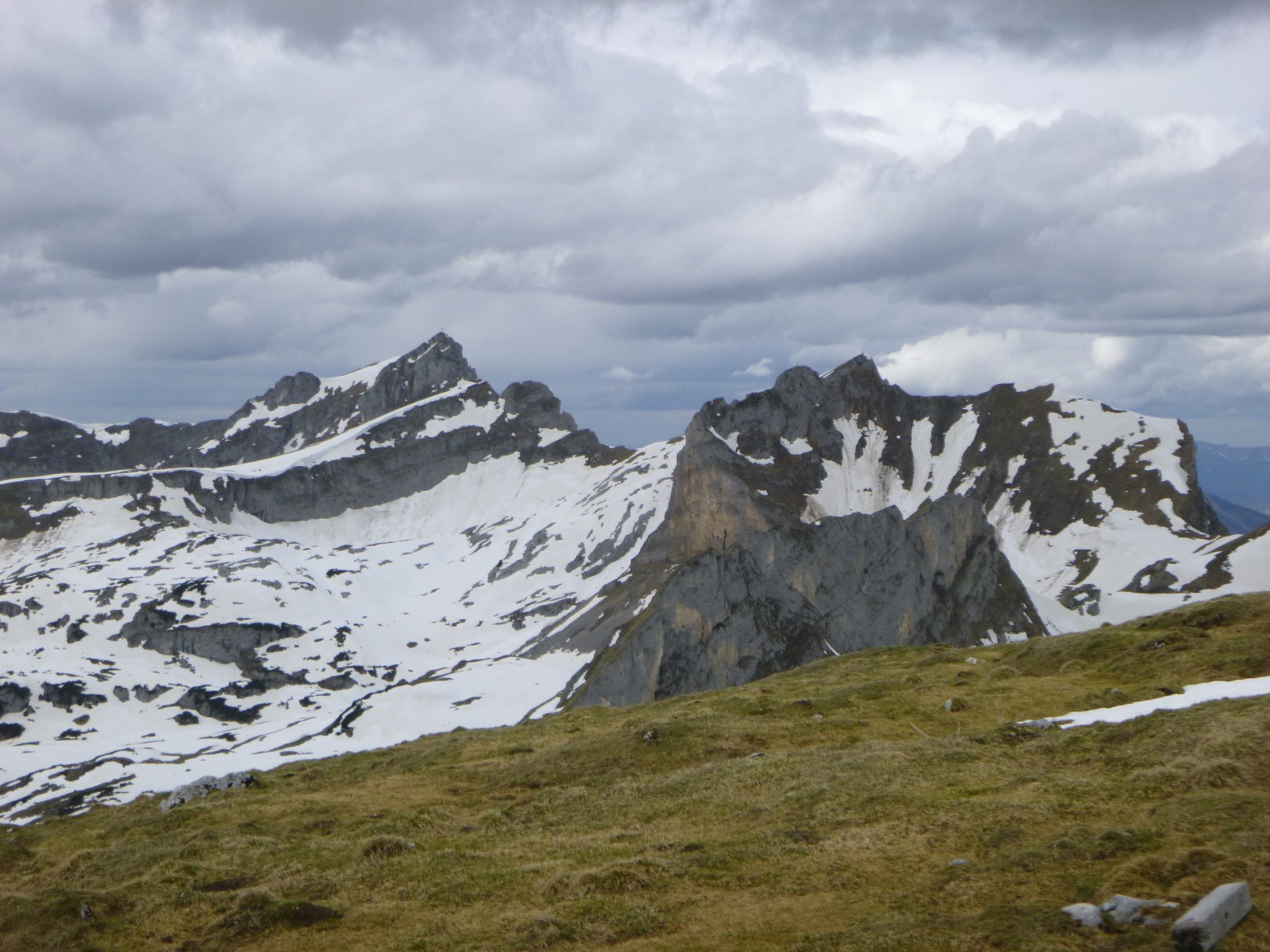 Tourenbeginn um 07:20 Uhr bei 8°C unter dünnen Schichtwolken am Himmel. Oberhalb der Bayreuther Hütte gibt es noch einige Schneefelder, welche wir mit Schneeschuhen querten, weil wir diese dabei hatten. Wäre aber auch ohne gegangen, da fester Trittschnee vorhanden war, ohne zu tief einzusinken. Entgegen der Wetterprognose zogen keine Regenwolken auf, sondern kam zeitweise gar die Sonne durch.