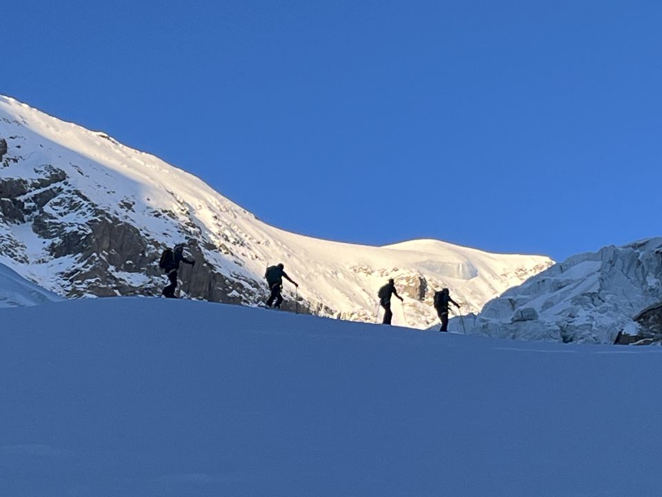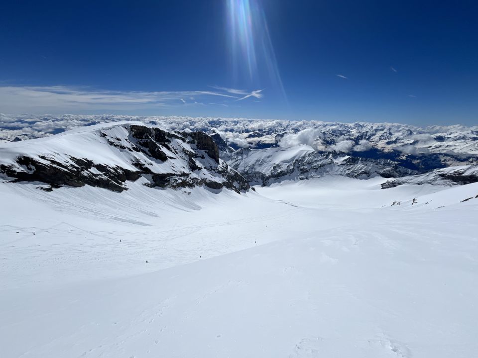 Start um 5:00 von der Fridolinshütte. Es hat eine sehr gut Aufstiegspur bis Gipfel, auch beim 2. Bruch gut, tiefe Spur, trotzdem Harscheisen hilfreich. Steigeisen, Pickel sowie Seil blieben im Rucksack. Im Vergleich zu letztenm Jahr hat es oben sehr viel Schnee. Um 10:15 am Gipfel, windstill, ausreichende Rast das es auch oben etwas auffirnte. Abfahrt um 11:15 oben gut, unten an den Brüchen weich, aber gut zu Fahren vor allem mit Board.