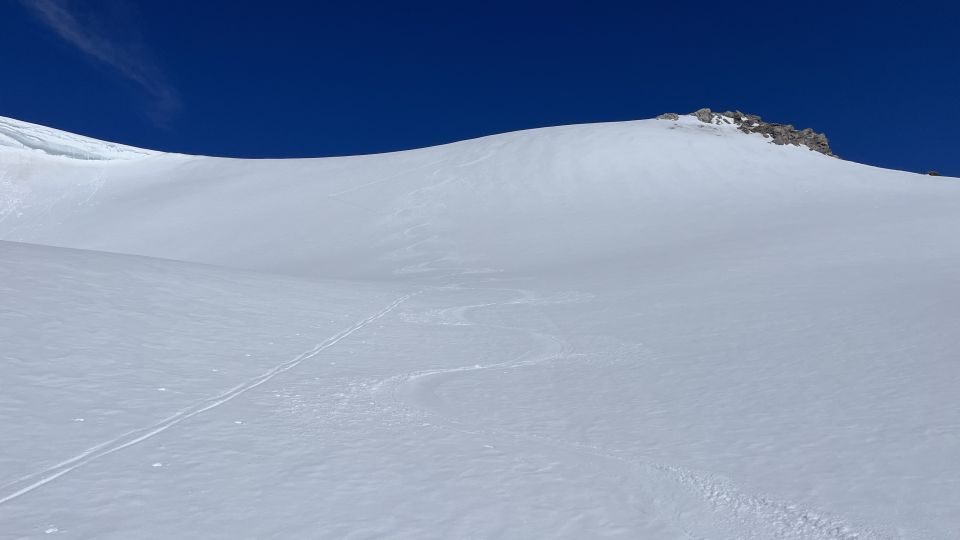 Abfahrt um 10.15 bei absoluten Traumverhältnissen bis auf den allerletzten Steilhang mit 50 Hm Eierschalenfahren.