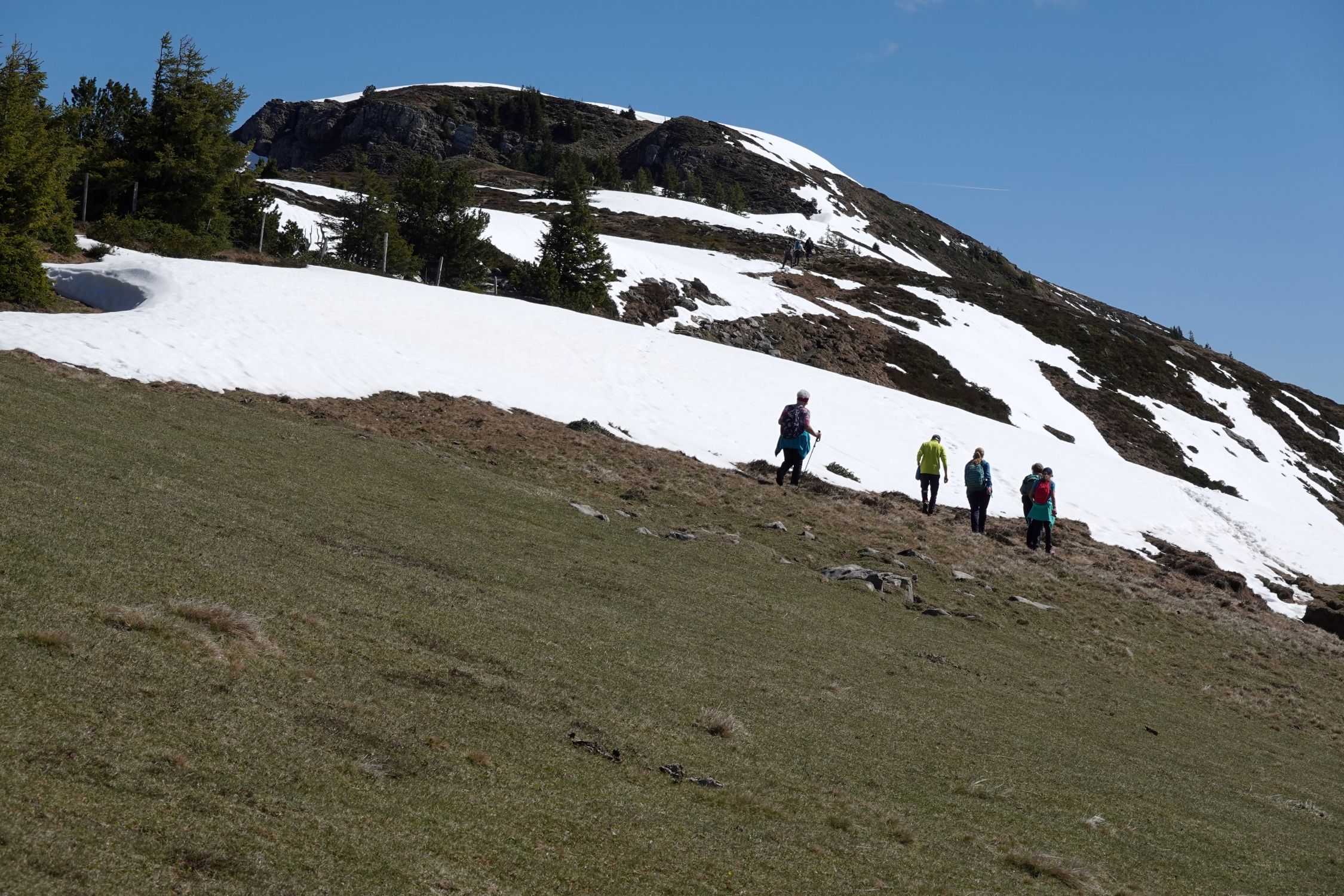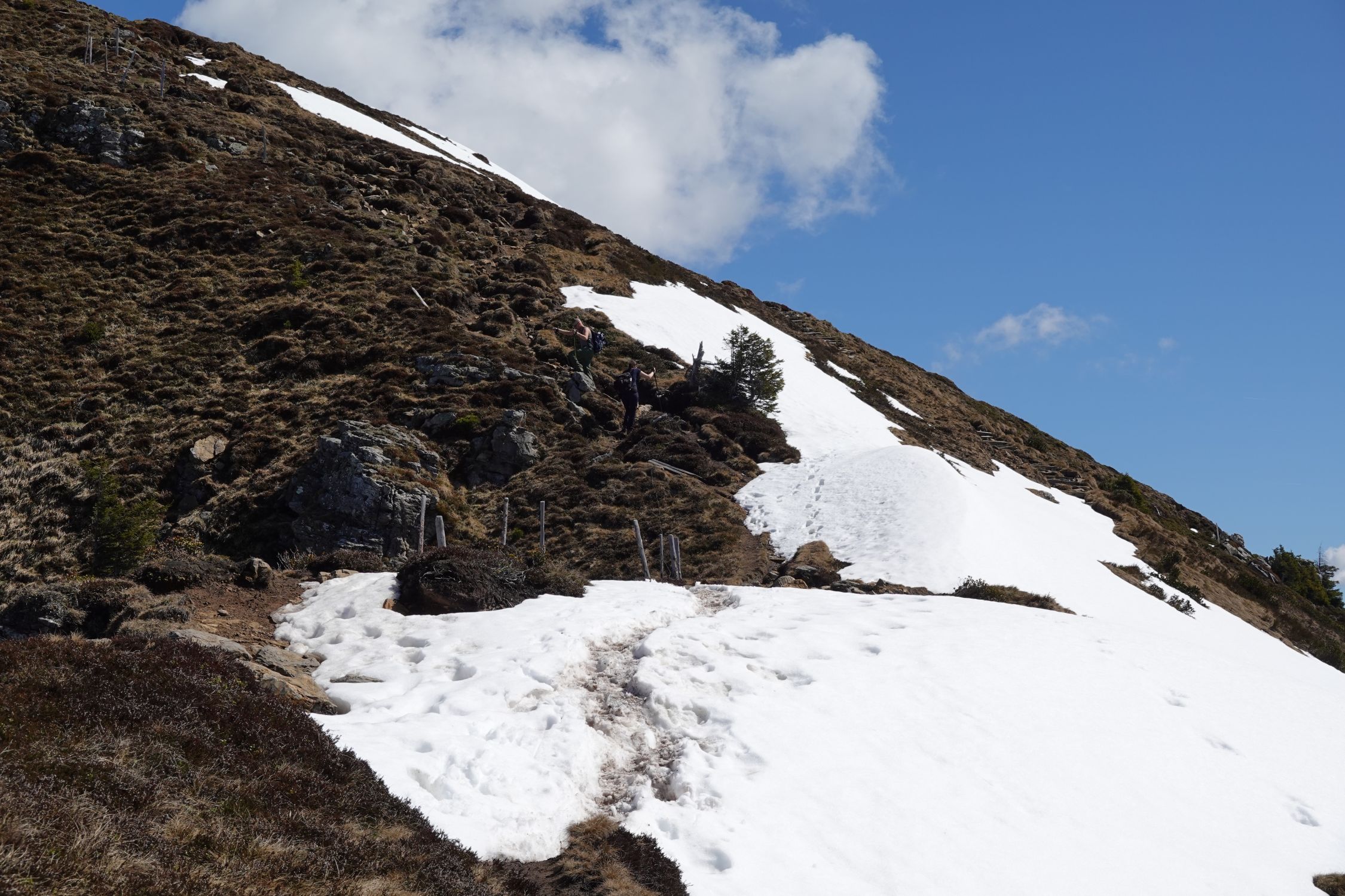 Es hat noch Schnee, Durch viele Begeher ist die Spur annehmbar. Man kann die Schneeflecken teilweise umgehen, aber nicht ohne schneepassagen geht es im Moment nicht. Nach einigen warmen Tagen wird sich die Lage bessern und , die Spur, vor allem im Abstieg nicht mehr so rutschig sein. Stöcke sind hilfreich.