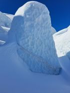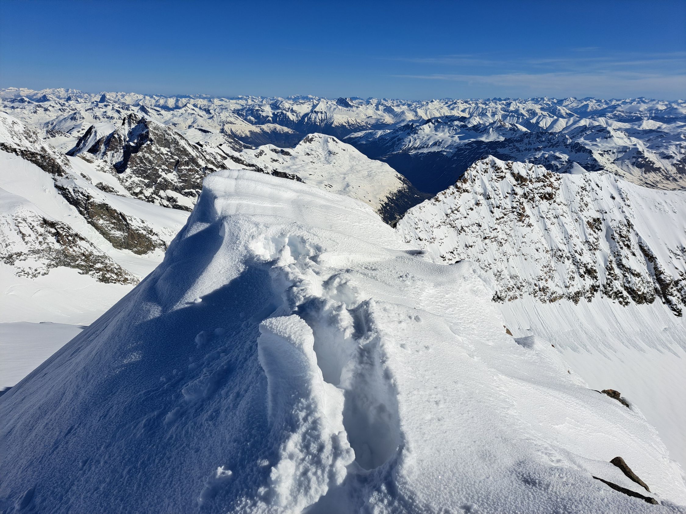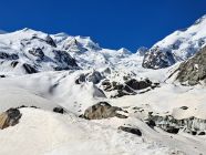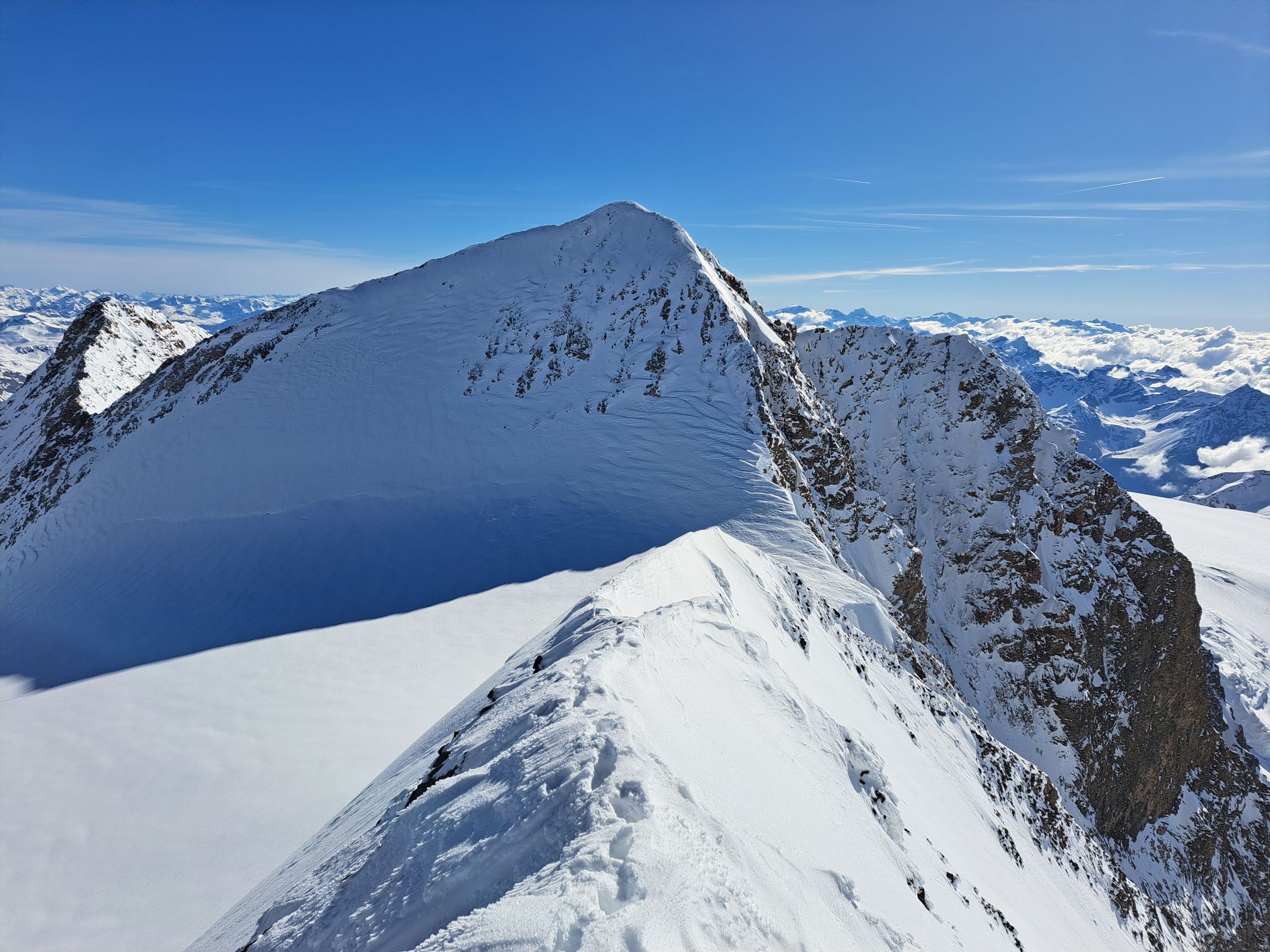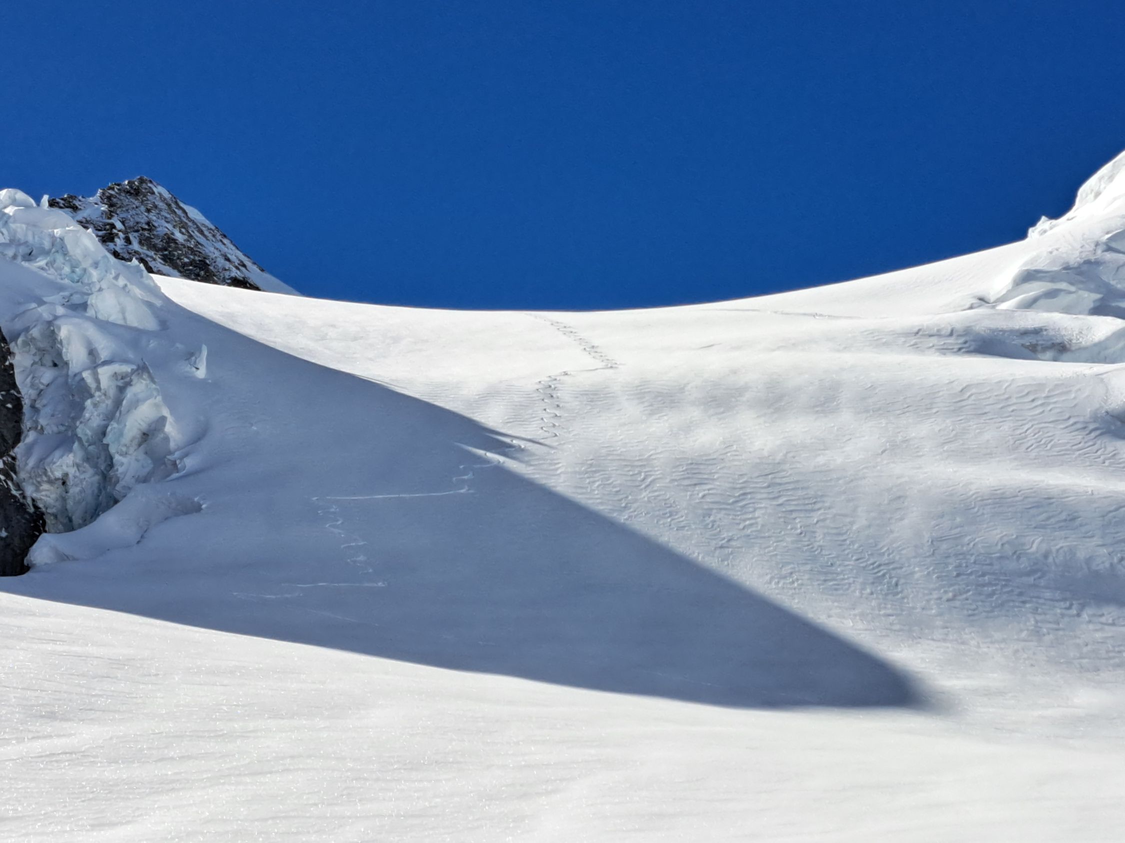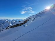 Viel Schnee, kaum offene Spalten. Ski tragen am Anfang ca. 15 Minuten, dann beginnt der Schnee. Ab 3500 selber gespurt. Am Gipfelgrat waren die Griffe und Tritte mit krustigem Neuschnee verdeckt. Von 3500 bis 3000 Bruchharsch. Um 5:00 Uhr gestartet und um 9:45 abgefahren. Starte 2 Stunden früher.