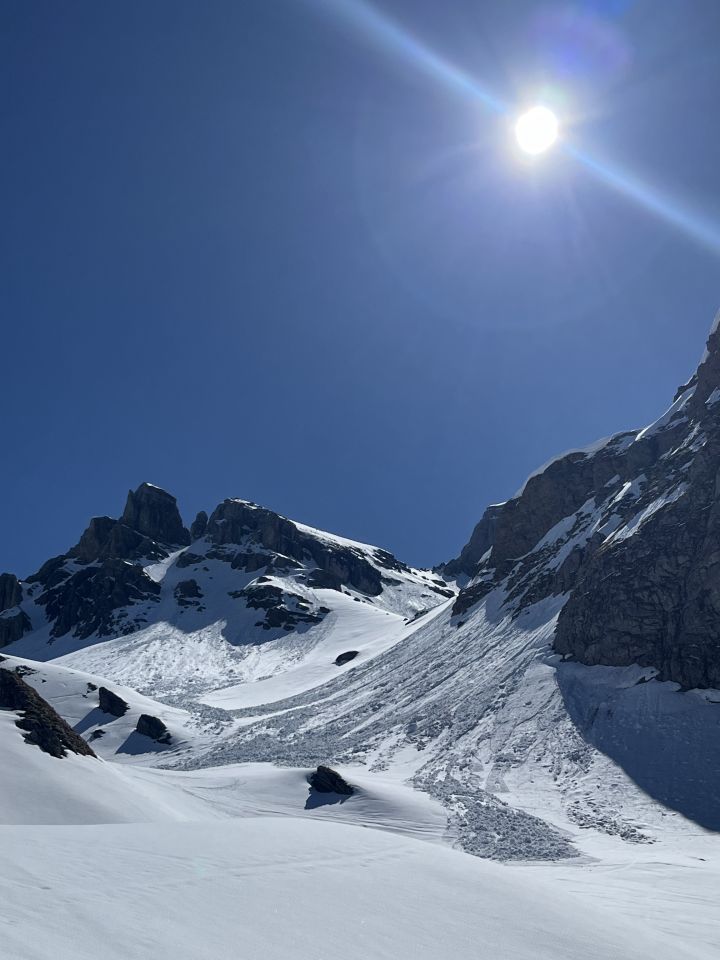 Tragende Schneedecke durch den Schwarzgraben und die steile Westflanke zum Hasenstöck-Sattel.