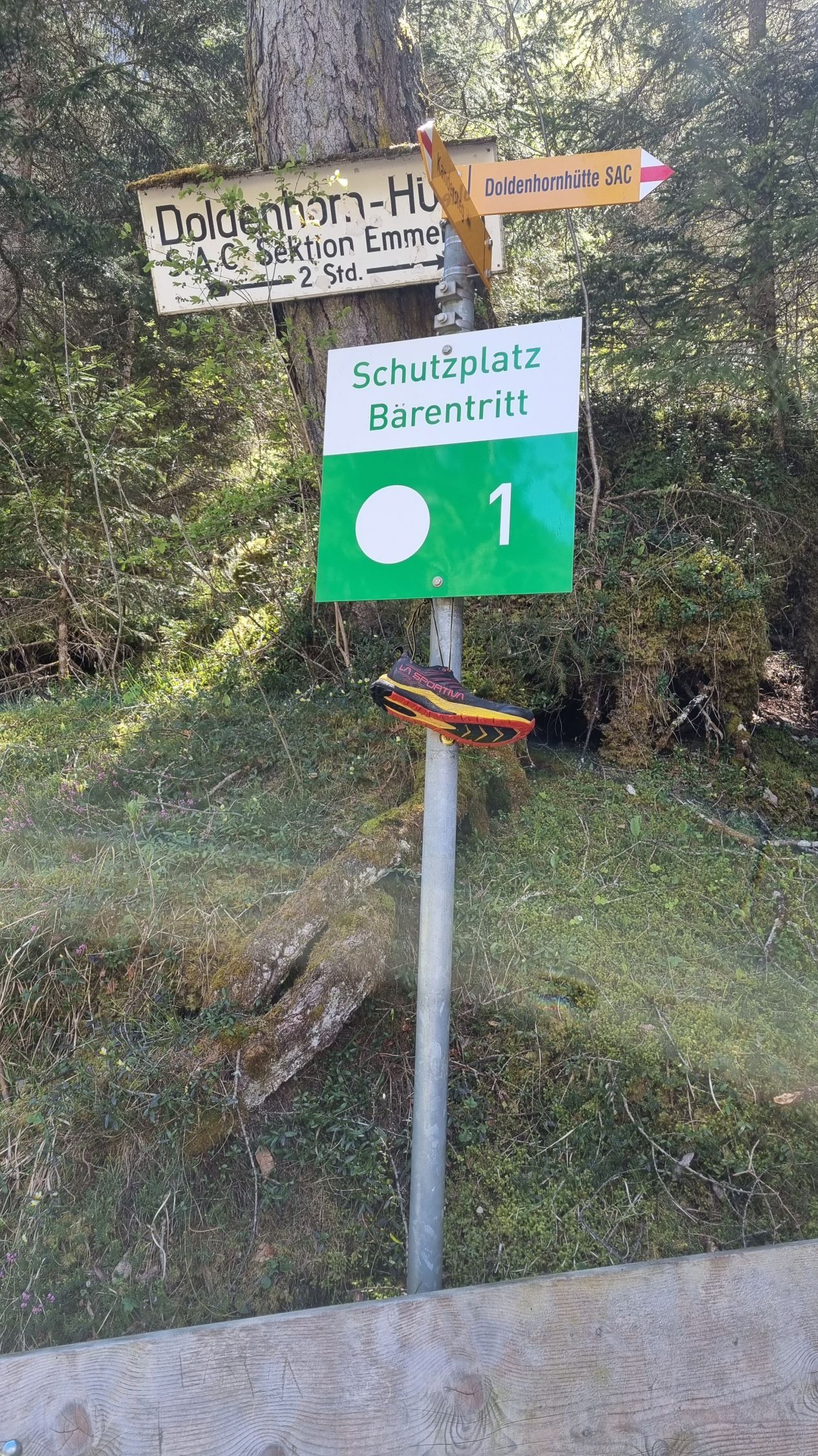 Habe einen einzelnen Turnschuh gefunden und ihn beim Start des Hüttenwegs deponiert (Foto).