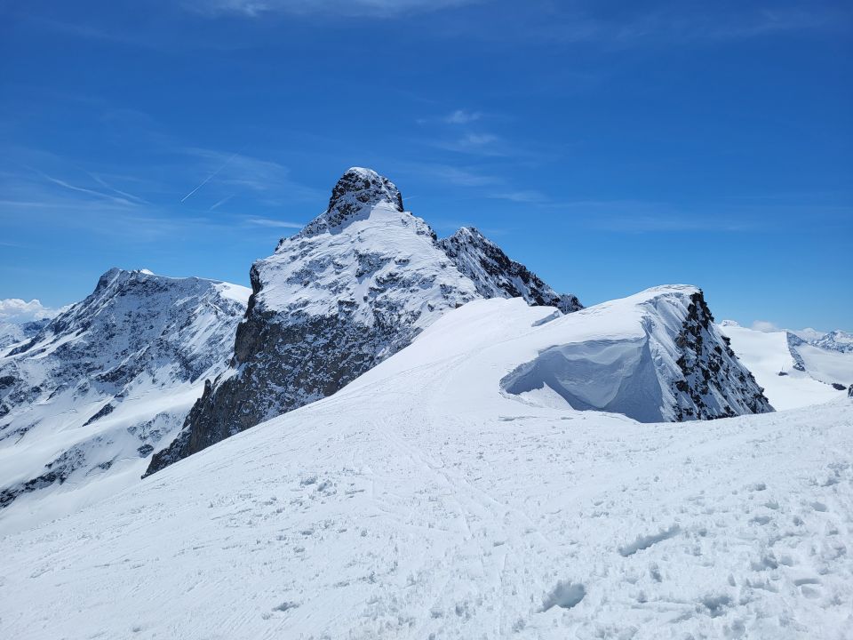 Start um 9 Uhr beim Hotel Steingletscher. Aufstieg im unteren Teil hart, aber ohne Harscheisen machbar. Steilstufe schon aufgeweicht, gute Spur. Im oberen Teil des Aufstiegs guter Sulzschnee.
