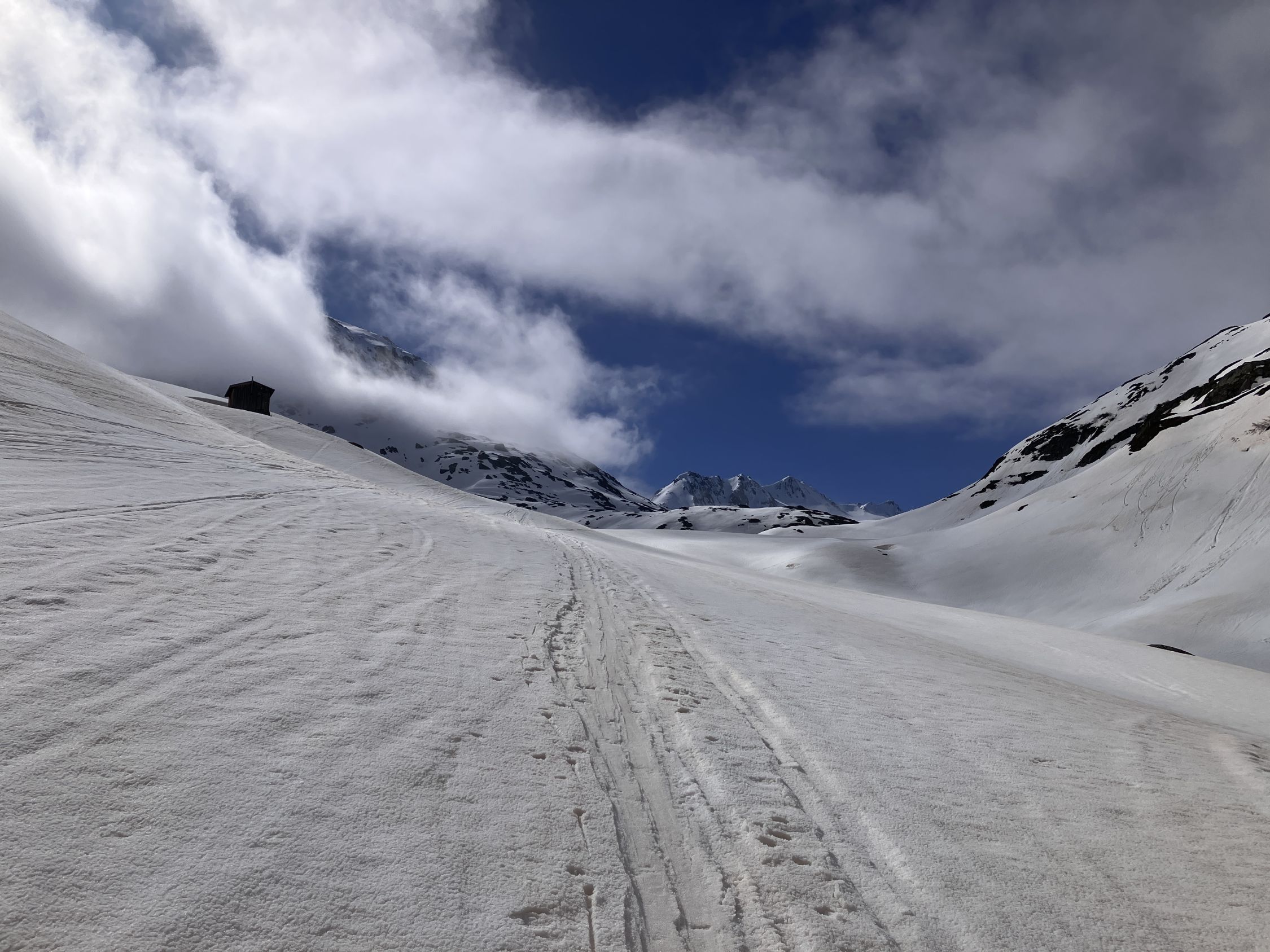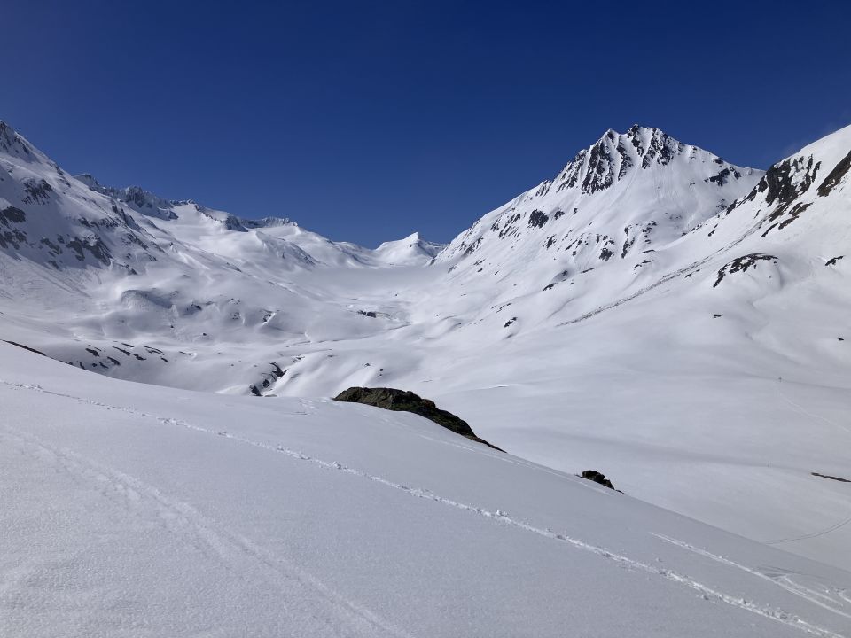 Start ab P 1830 an der Passstrasse, Skis konnten direkt montiert werden. Wegen Aufbruchs kurz vor neun Schnee im Aufstieg zum Gipfel scho recht pflätschig. Abfahrt um 13 Uhr gerade noch gut.