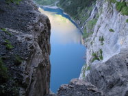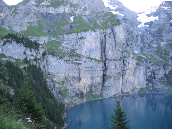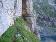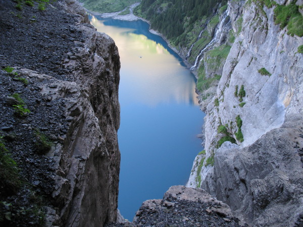 Schaut man frontal auf das Grasband der Unteren Fründenschnur (etwa beim Zugang von Kandersteg am Westufer des Öschinensees), dann sieht das sehr abschreckend aus. Aber: es ist nicht annähernd so schlimm - im Gegenteil: das Weglein läßt sich erstaunlich gut begehen. An einigen entscheidenden Stellen Fixseile - trotzdem absolute Trittsicherheit und Schwindelfreiheit nötig!